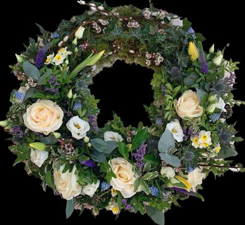 An attractive alternative to a traditional wreath. This wreath is made using a natural base covered with moss and fresh flowers. As no floral foam, plastics or wire are used, this arrangement will naturally degrade over time. Plants and bulbs can also be incorporated on request.