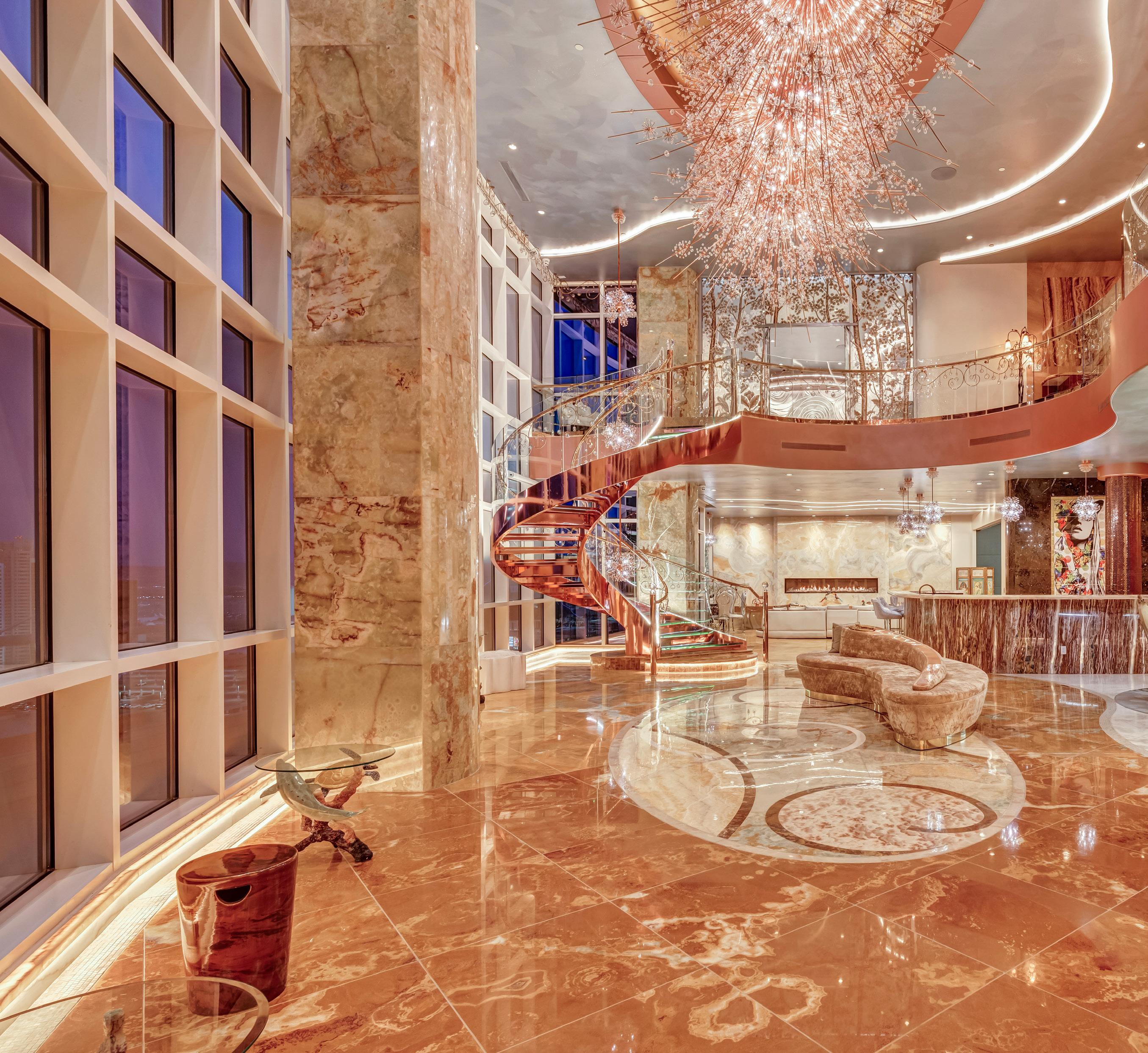 PROPERTY HIGHLIGHTS: Rising above Dean Martin Drive, this rare, three-level Panorama Towers residence offers 8,017 square feet of custom-designed living with sweeping Strip views and bold artistic expression. From the hand-painted dance floor and Swarovski Rose chandelier to the marble flooring and wrap-around Sky Deck, every detail is crafted for luxury. The chef’s kitchen features black marble countertops, copper sinks, Wolf appliances, and an elevated wrap-around bar. The upper-level primary suite includes a custom art wall, lounge area, and a spa-inspired bath with an elevated tub, dual vanities, and two high-tech showers, all accessible by a striking staircase or pneumatic elevator.