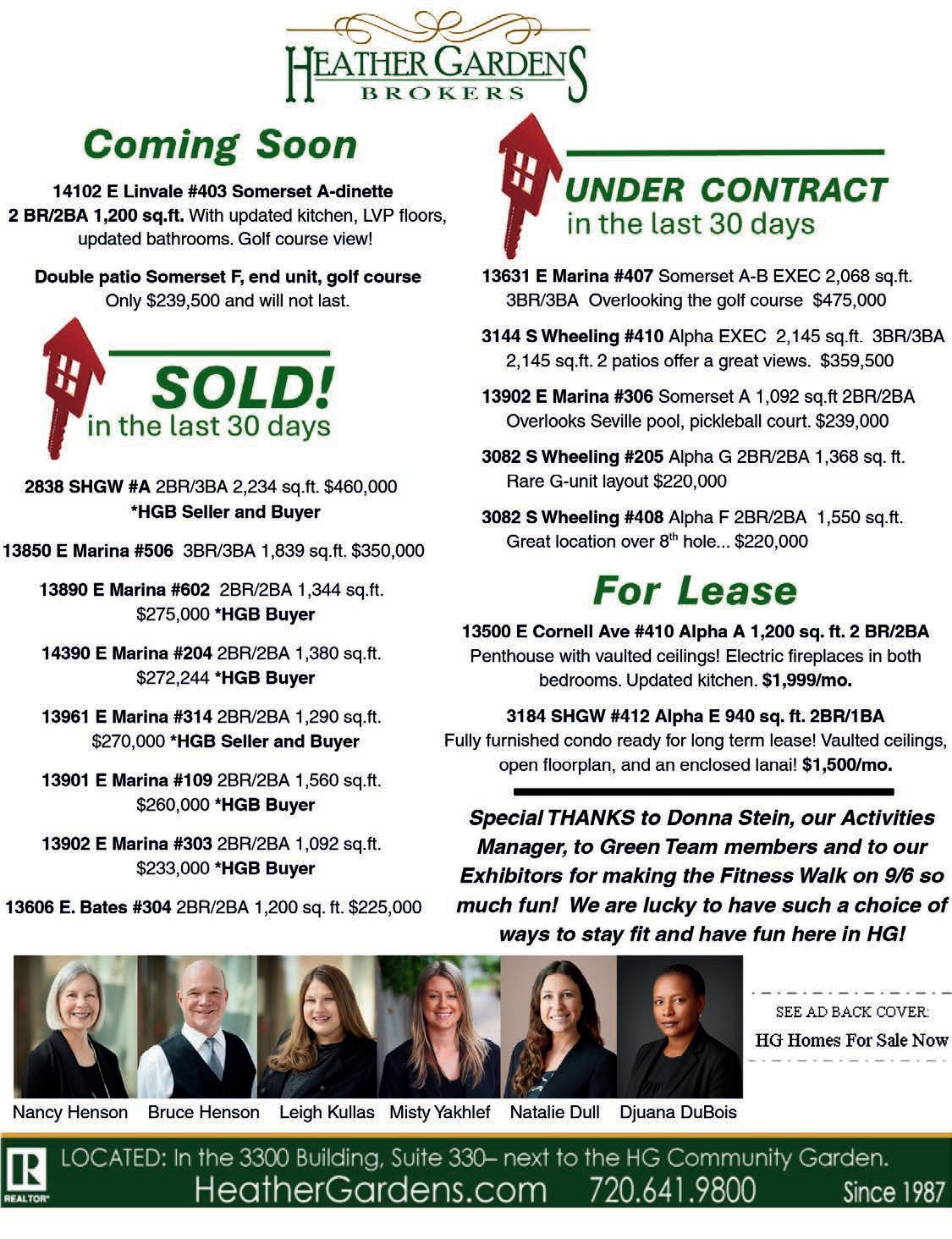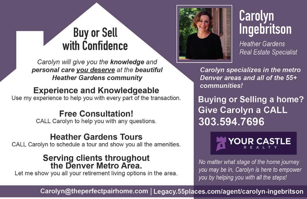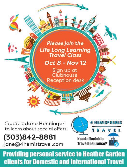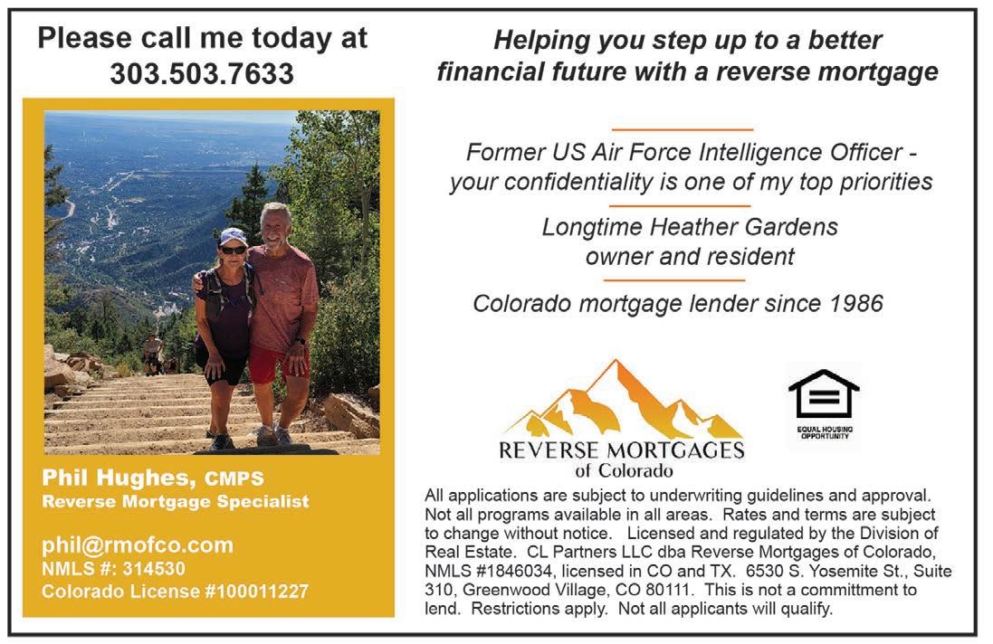 Subscriptions: To accommodate owners, who wish to receive Heather ’n Yon while away, the publisher has a subscription policy. Provide a forwarding address, plus a check for $3 (payable to Bluefish Publishing) for each issue desired. Annual subscription is $36. You may drop off your check with address information and what month the subscription should start at the HG Management Office. Alternatively, mail to Bluefish Publishing, LLC 19809 E. Columbia Ave., Aurora, CO 80013. Past issues (2024) are available on www.heathergardens.org/Resource Center