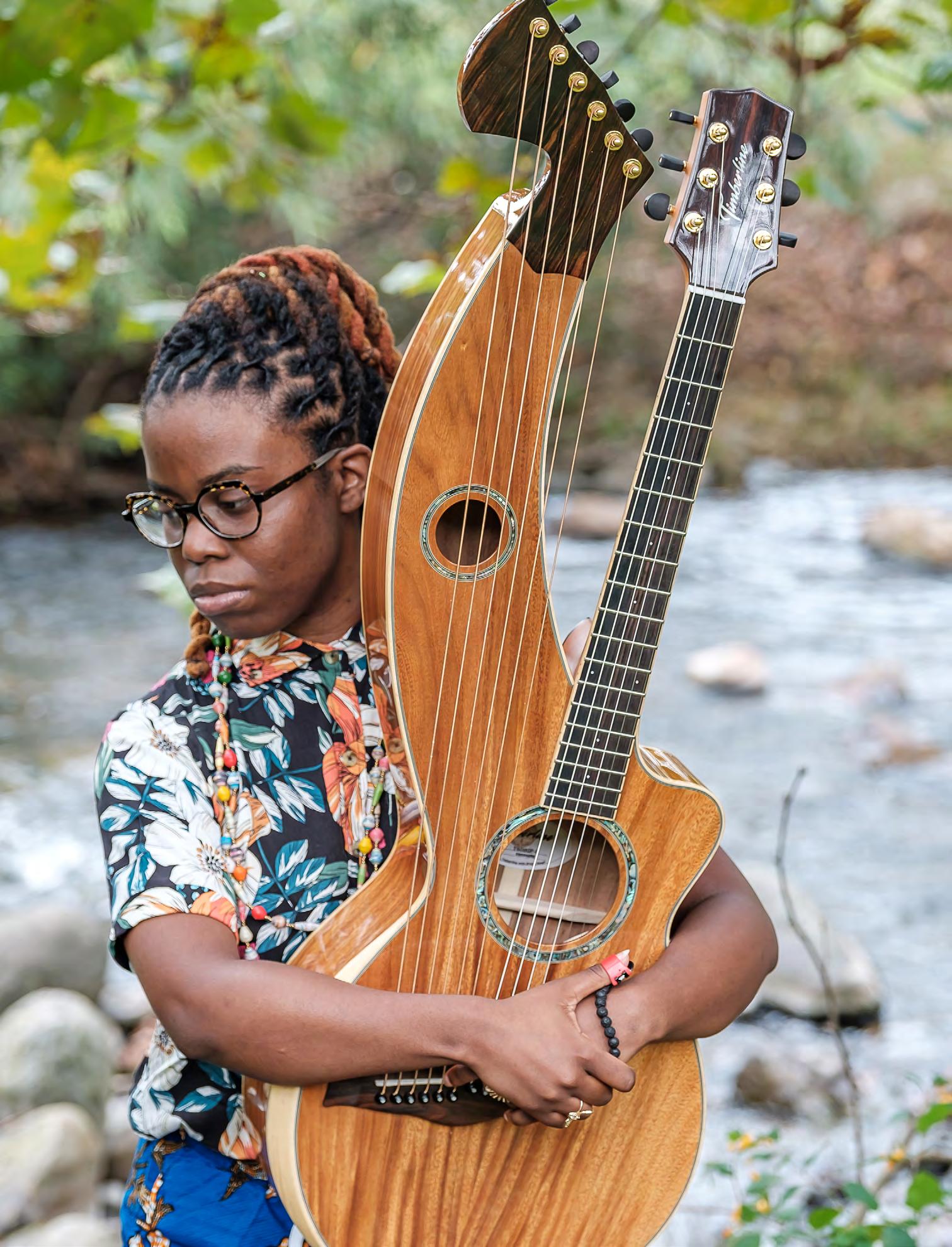 Yasmin also plays the kalimba, a type of African thumb piano, and the harp guitar. “Mine is a Timberline parlor-size harp guitar with six floating bass strings. I really like the sound of it.”