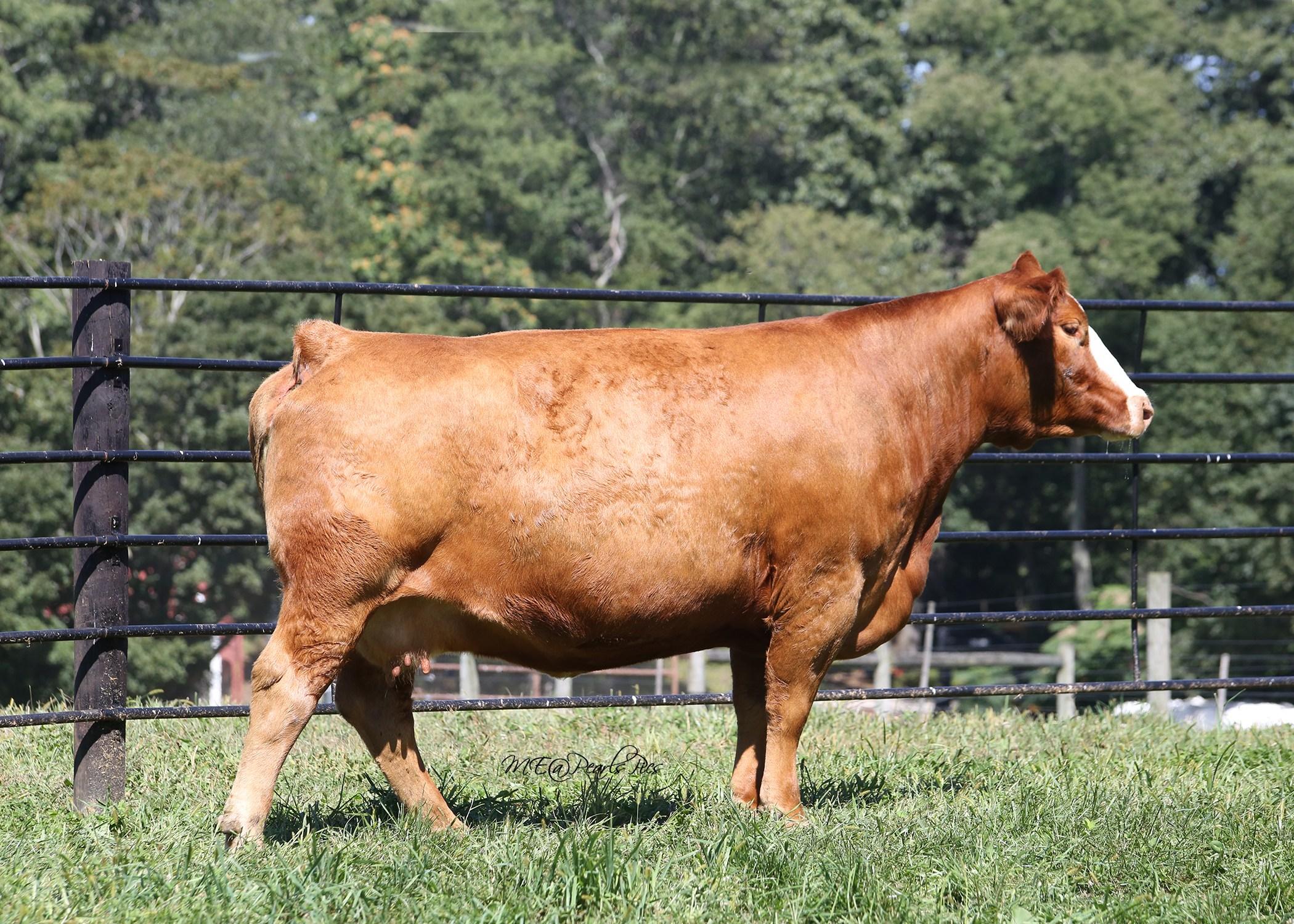 I have been fortunate in the connections I’ve made in this business. Ruble found this bull at Neidig’s a few years ago and offered to be partners on him. Last year at the 2nd Blue Ridge Classic, we took the opportunity to be majority owners on him after selling several heifers bred to him. I think this bull has a big place not only in our operation but the Simmental breed as a whole. This solid red purebred is one that is an eye catcher for sure. We have been impressed with his first set of calves are excited to use him more. We had the opportunity this summer to collect him and I want to share him with the entire Simmental breed. He is big footed, stout and sound. He has ton of rib shape and dimension and always looks his best. We are offering 100 units of semen, sold a minimum of 5 units with the option to take more. Let this stud be a part of your herd as well.