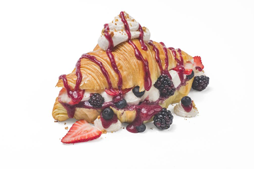 Relleno con crema dulce de queso, acompañado con infusión de fresa, jamaica y canela, con mix de frutos rojos y coronado con crumble de especias.