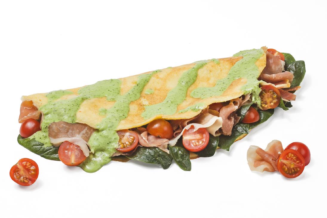 Relleno de jamón serrano, tomatito cherry y espinacas, acompañado con crema de cilantro.