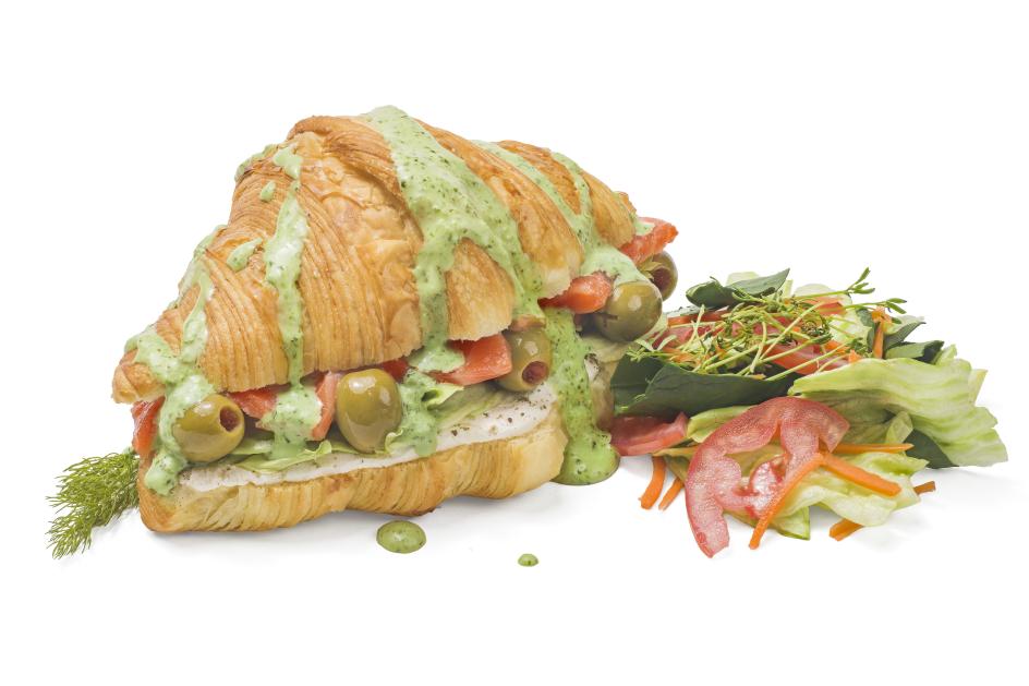 Salmón en fajitas, queso crema con especias, lechuga, aceitunas y crema de cilantro.