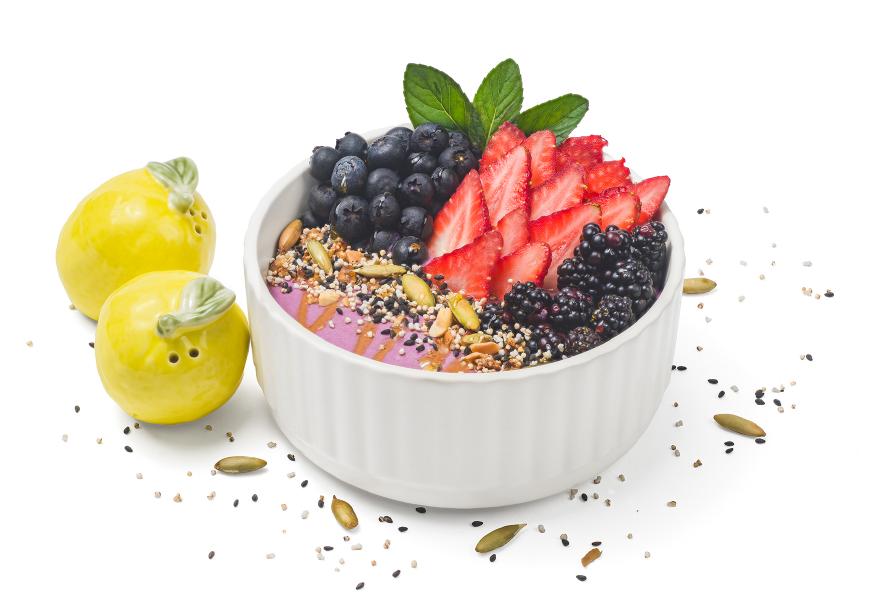 Base de açaí, plátano y leche vegetal, coronado con frutos rojos, mix de semillas y miel de abeja.