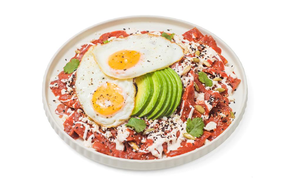 Bañados en nuestra cremosa salsa de camote, queso, crema, cebolla curtida, aguacate, y mix de semillas.
