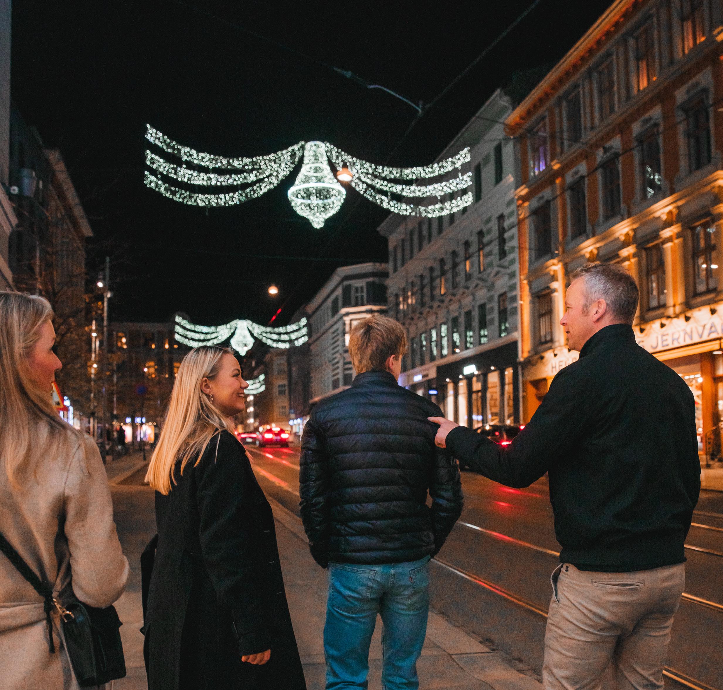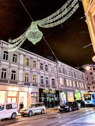 Nå he N ger våre lysekroner fra Parkveien og helt opp til Kirkeveien. Majorstuen & Bogstadveien Næringsforening ble etablert da felles julegatebelys ning ble kjøpt inn i 1964. Å lyse opp gatene til jul og i en ellers mørk årstid har vært veldig viktig for næringsforeningen. Derfor kaller vi det også for Vin terbelysning. Men i år vil vi installere tidsstyring, så vi ikke bruker unødvendig strøm.