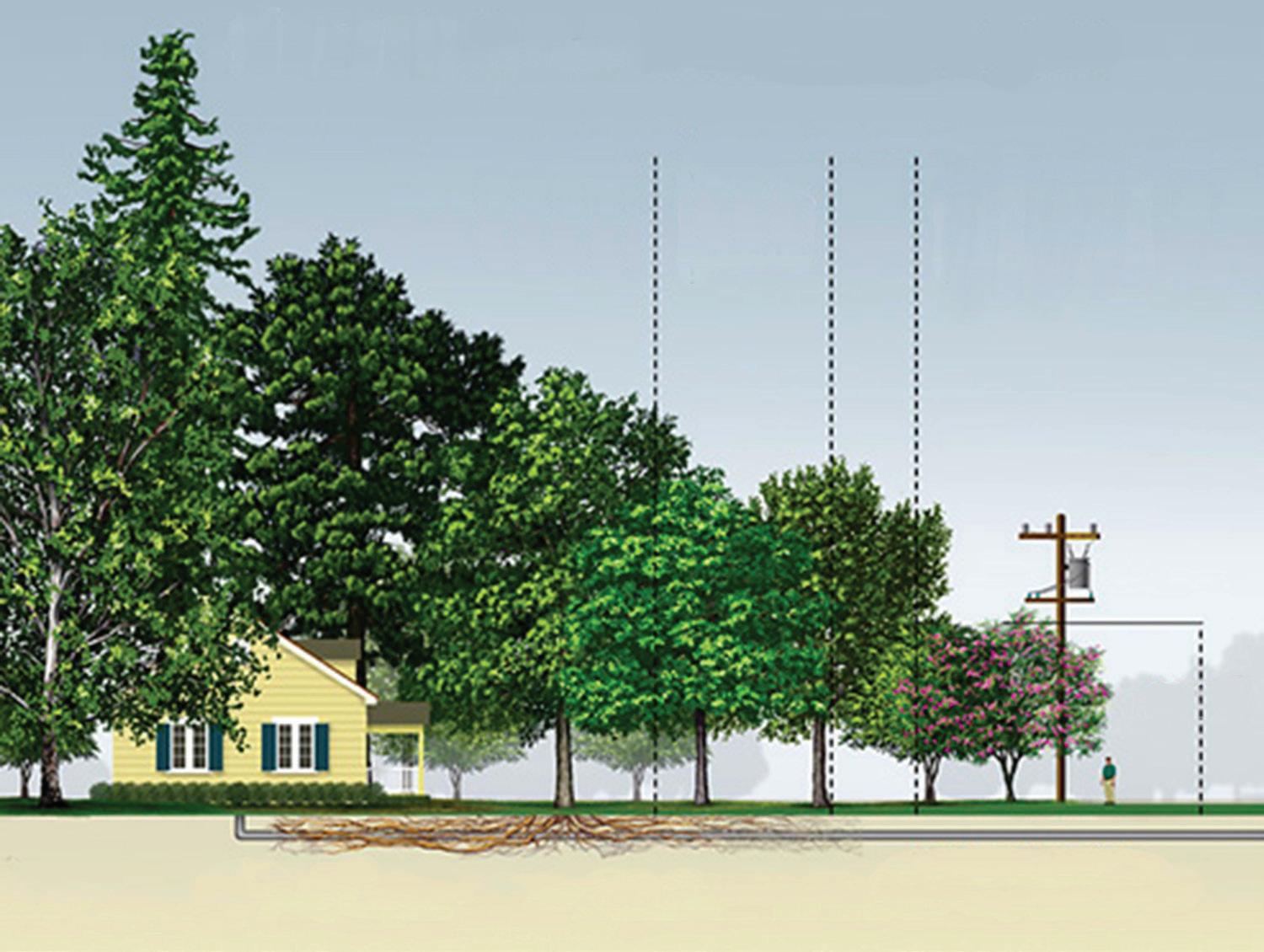 Be mindful of power lines when planting trees. For underground power lines, trees should be planted far enough away from the pad mount equipment that when they reach maturity, overhanging branches won’t obstruct a crane from removing a defective transformer or setting a new one. Trees, shrubs and other landscape plantings should not be placed on the utility easement above underground electric cable. Do not change the grade around equipment to avoid problems with access and