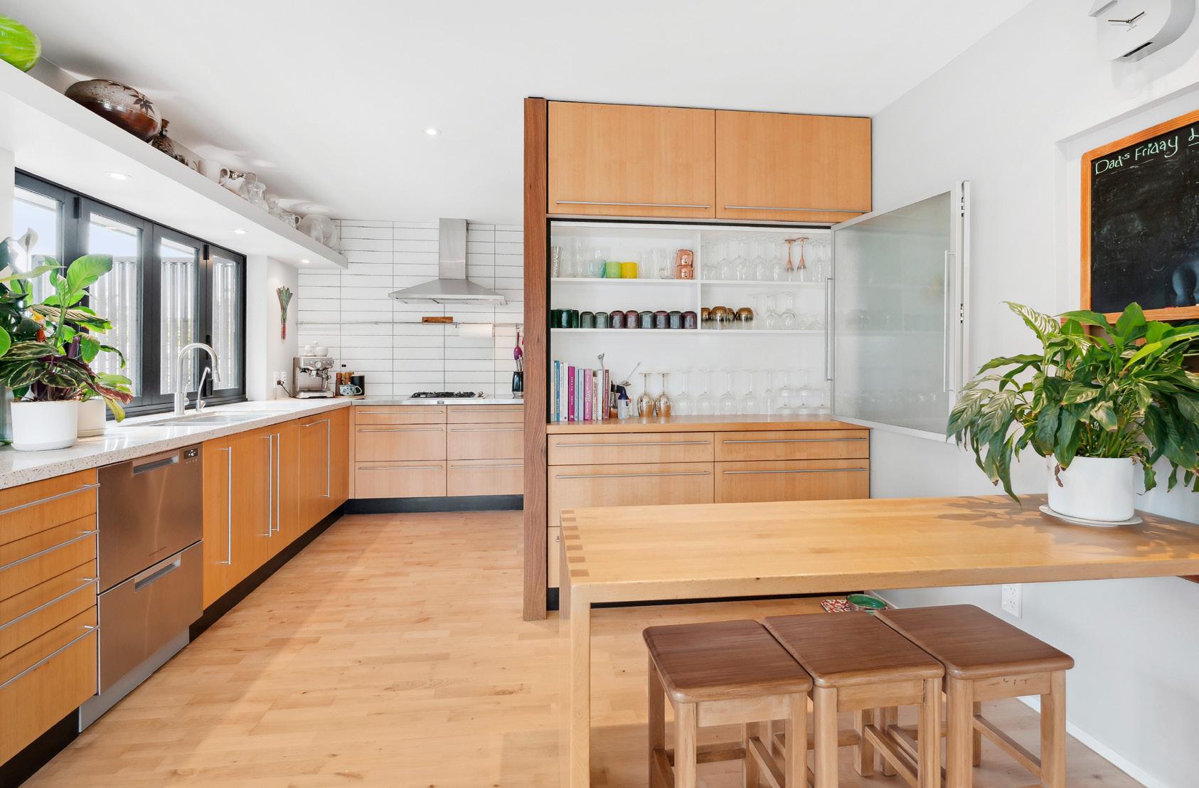 It’s hard to imagine this kitchen is part of a property built in the 1990s, so complete is the extensive renovation. All is light and lovely in this generous space, where pale timber tones in the cabinetry pick up on the rhythm of exposed rafters. There is something Scandi in its aesthetic (could be the maple timber), something modern-classic in its layout. Long and linear is the name of the game and LED lighting makes this a feature piece come evenings. For more on this home, turn to page 172.