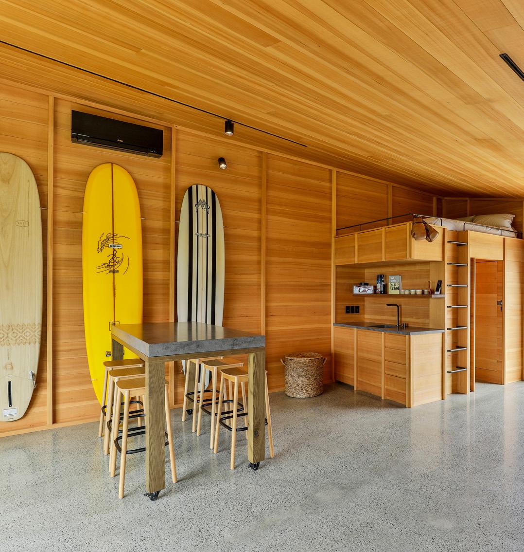 Inside, the brickwork continues as a tactile expression, complemented by maple joinery and carefully selected floor tiles. Together, these materials lend texture and warmth to the cleanlined interiors, beneath cathedral ceilings with exposed structural trusses. Every detail has been