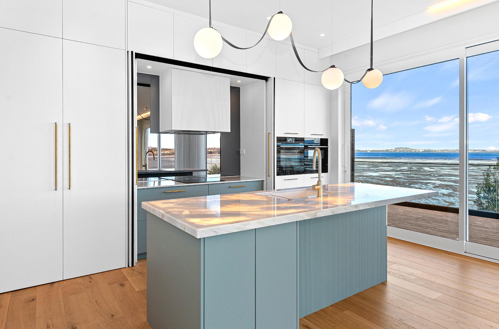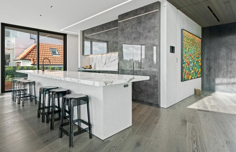 as much art as a means to the upper floor, the light flooding through skylights and floor-to-pitchedceiling glazing, and the kitchen with its marbled and fluted curved island.
