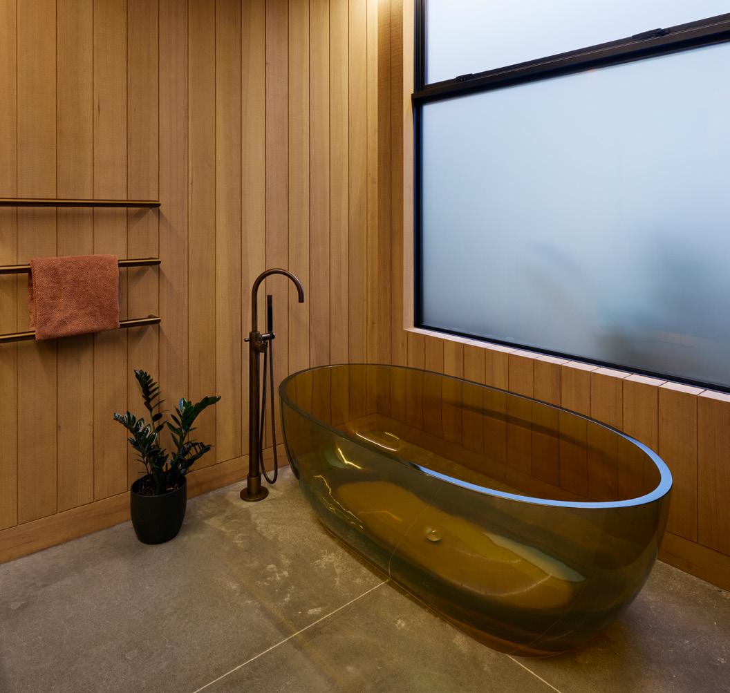 Hemlock-lined walls lend a Scandinavian sauna vibe to this minimalist bathroom in Ōtūmoetai — the ensuite to the main bedroom. The glass bath provides an element of surprise and keeps the feeling light and airy; its dark tint ties in cleverly with the the taps, window frame and towel rails, which work to provide a tonal juxtaposition to the light wood. On the floor, large-format tiles reinforce the earthy nature of the space and add a reassuring natural feel underfoot. For more on this home, turn to page 38.