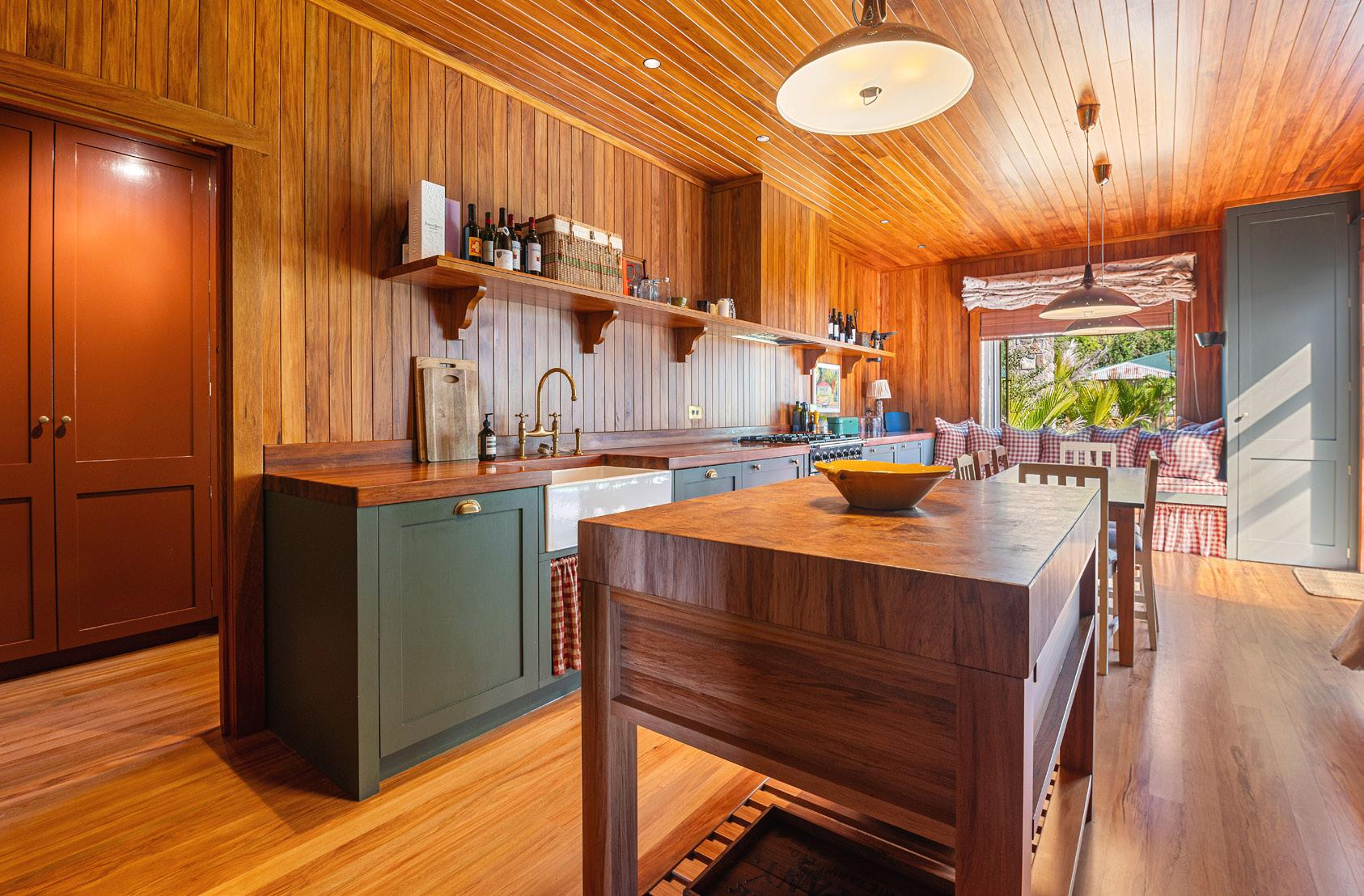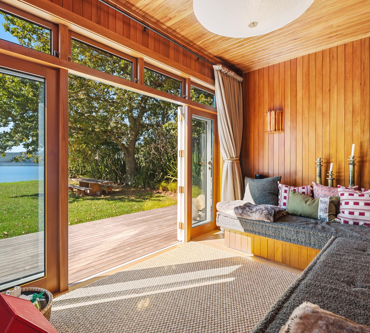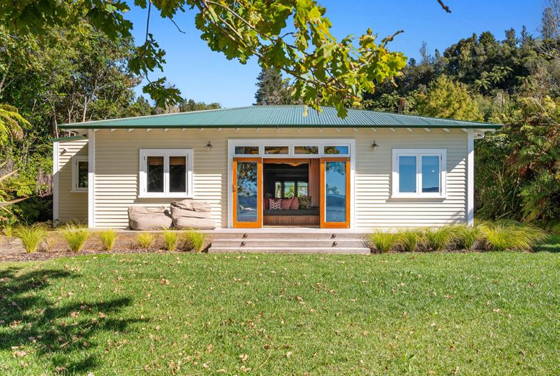 main bach and new structures echo the architecture of the 1930s, with native timber and handcrafted elements — including custom built rimu furniture — defining the interiors. Indeed, the level of detailing is remarkable: solid rimu flooring and wall linings, hand-built vanities and doors, UK-sourced fittings and 60mm rimu benchtops in the kitchen, laundry and scullery. Solid timber windows feature rimu jambs, and bathrooms include handmade tiles and solid brass fittings.