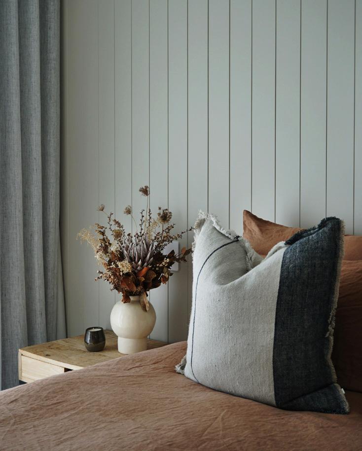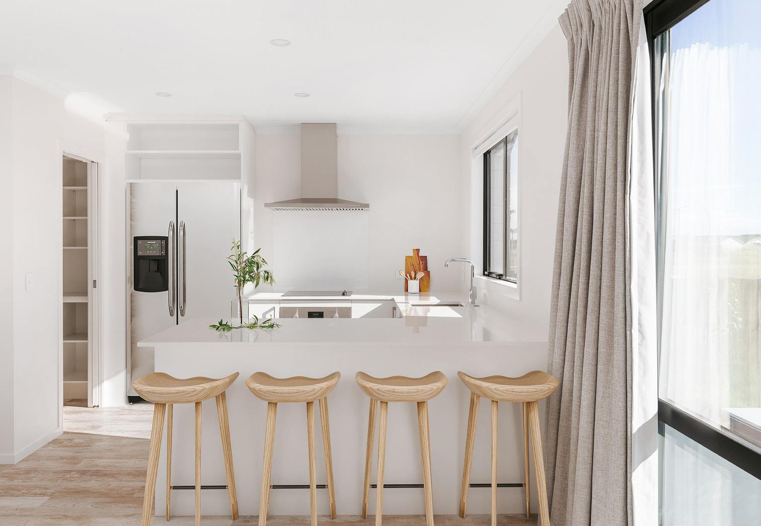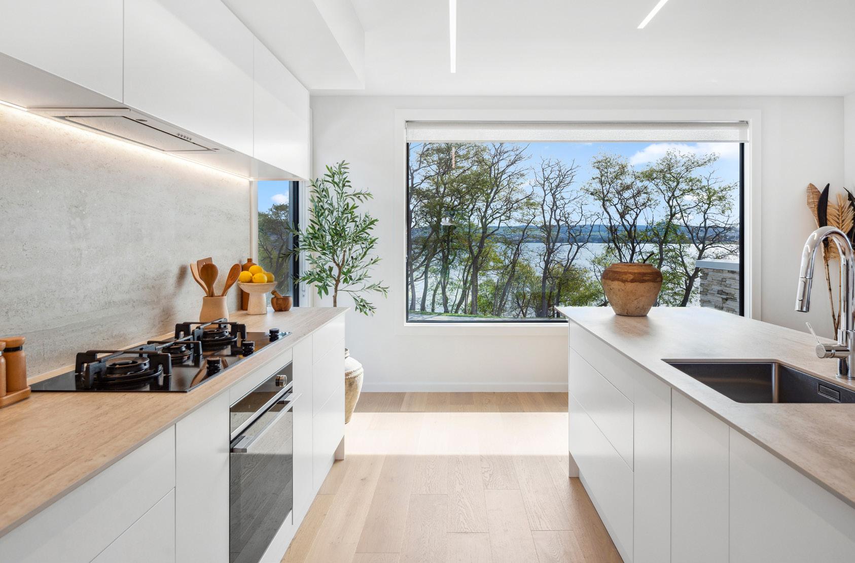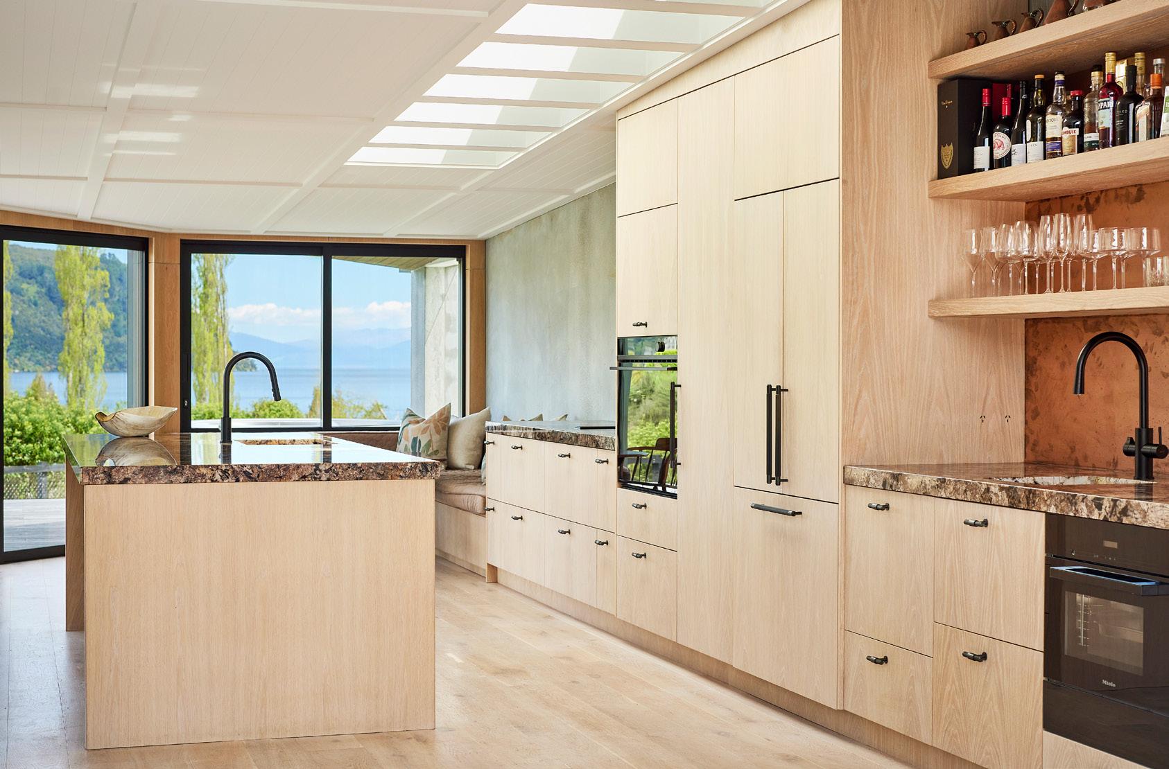 Holiday homes call for a different approach to kitchen design — one where people might be darting in and out, looking for the wine glasses. This Kinloch kitchen, wrapped in pale timbers, has ample room between back bench and island, tonnes of storage, a bar with open shelving to one side and a comfy bench seat on the other where guests can connect with the cook and the view. Even though the integrated fridge might be tricky to find for first-timers, the double cabinetry doors are a clue. For more on this home, turn to page 32.
