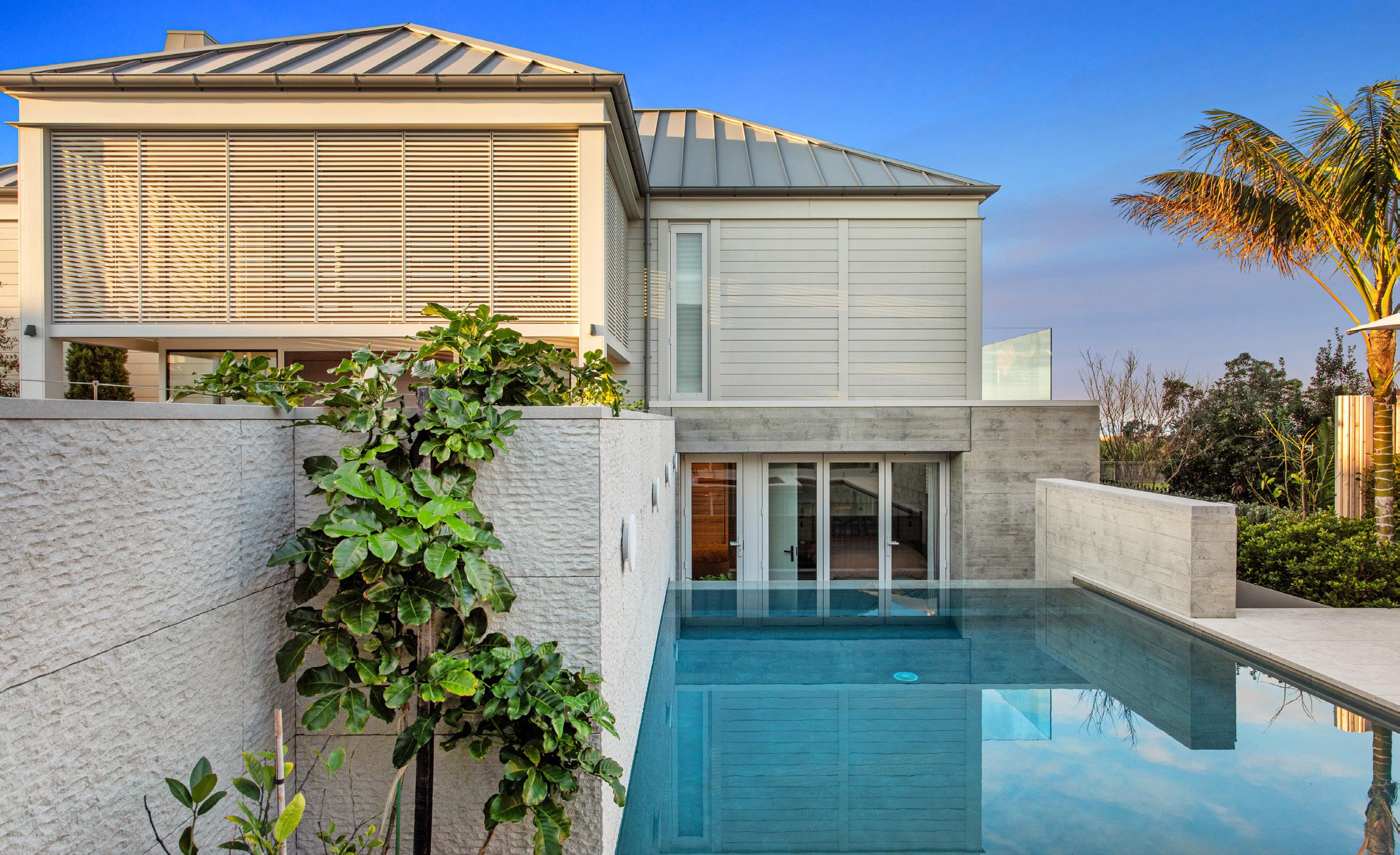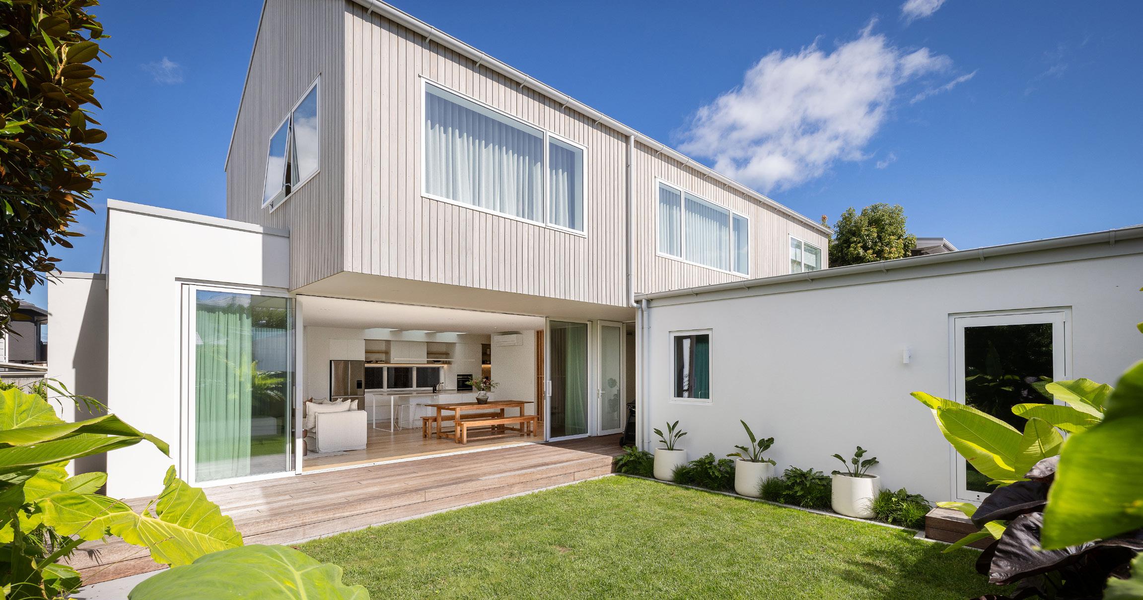 Inspired by the owners’ love of the sea, the house now features a striking five-metre-high clerestory pop-up roof with aluminium joinery that captures panoramic harbour views and floods the interior with natural light. Aluminium vertical weatherboards and painted plastered feature walls with screen detailing elevate the contemporary façade.