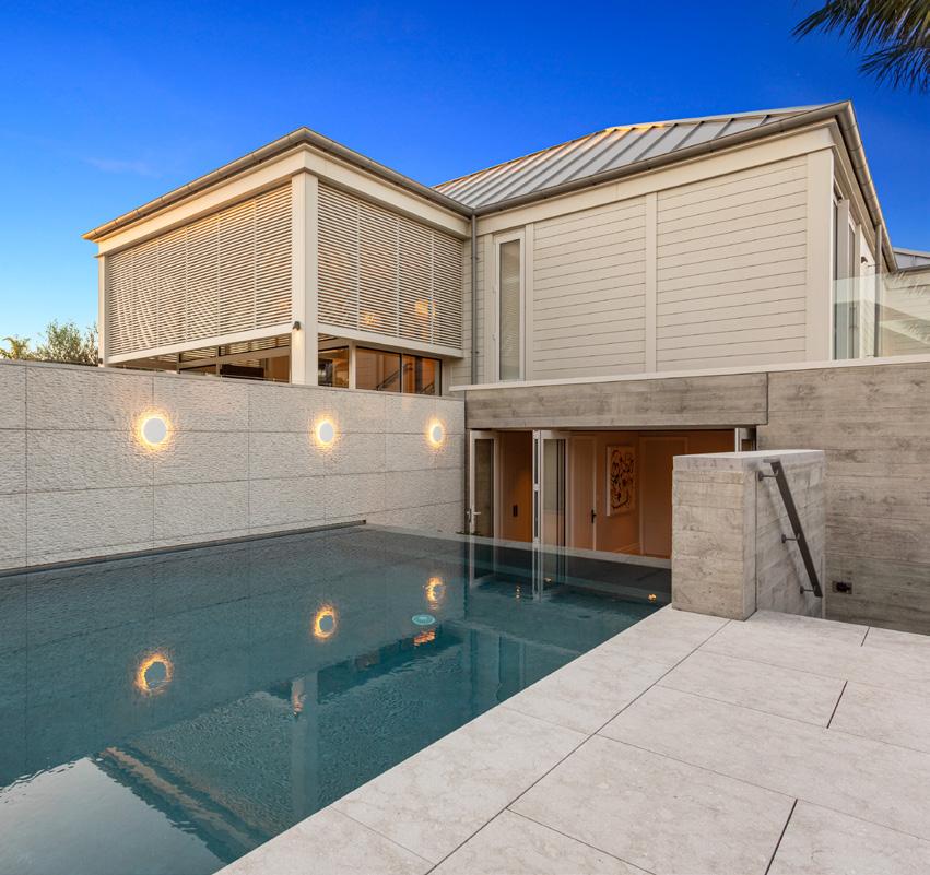 A bold architectural vision has transformed this home into a statement of refined coastal living. The original structure has been expertly reimagined by removing two upper storeys and retaining the solid plastered block base, laying the foundation for a breathtaking new form.