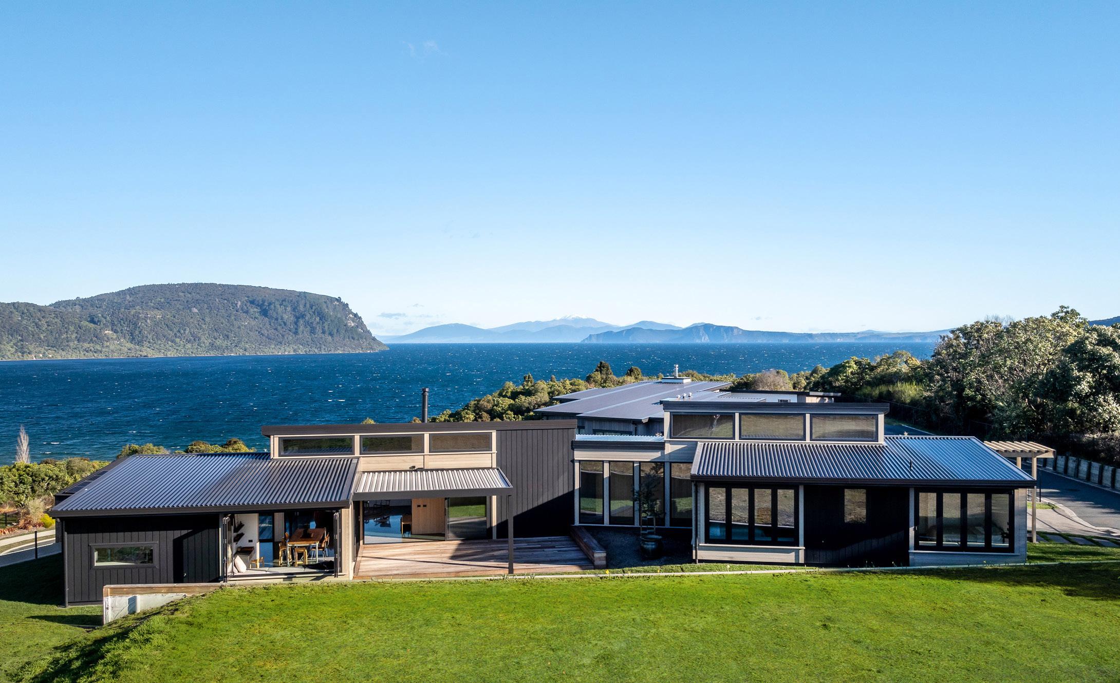 Set across a long, fully grassed section framed by punga fern fencing, this lakeside retreat feels more like a private resort.