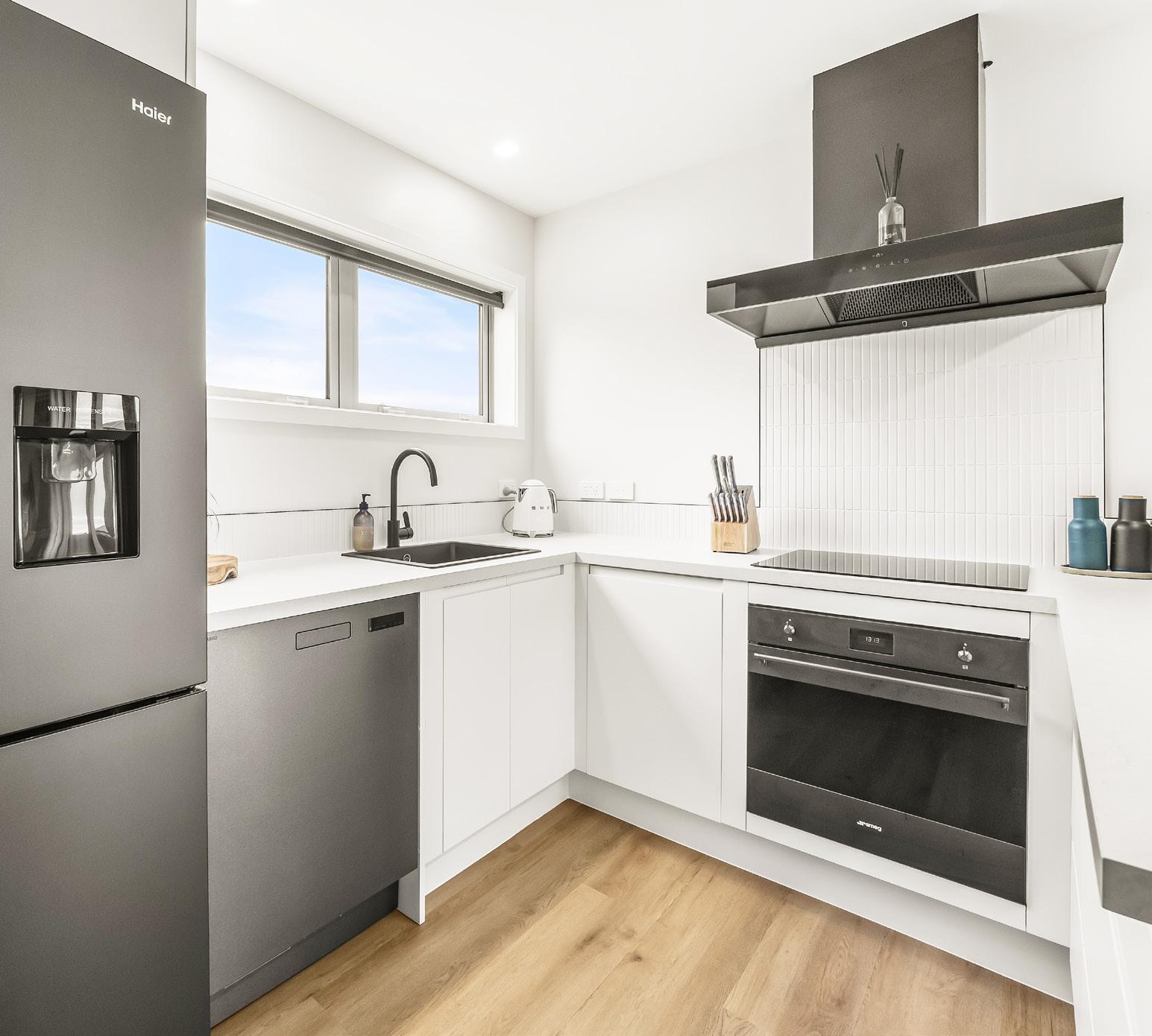 This new-build offers the perfect balance of privacy and presence. Clad in a contrasting mix of light-toned concrete panelling and dark vertical weatherboard, the home presents a crisp, modern face to the street. A double-gable form anchors the façade, adding depth and interest.