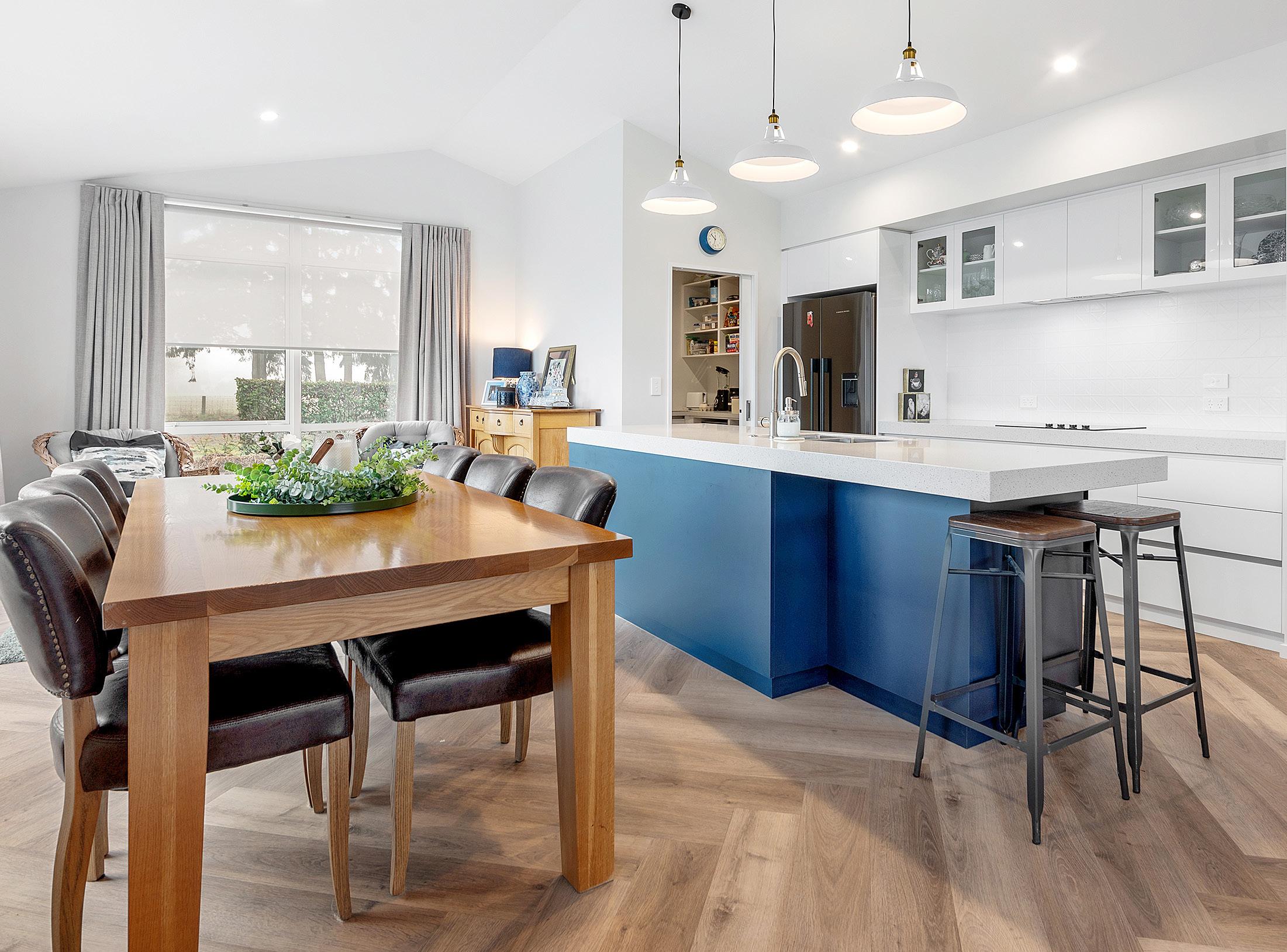 What began as a tired two-storey brick home is now a high-end weatherboard villa that blends formality with relaxed sophistication. This West Melton property has been thoroughly transformed to suit modern living, while still nodding to its classic roots. The home’s generous proportions have been maintained, including an eight-car garage, and improved on where required. The central open-plan kitchen, dining and living zone is now a light-filled hub. Complementing this,
