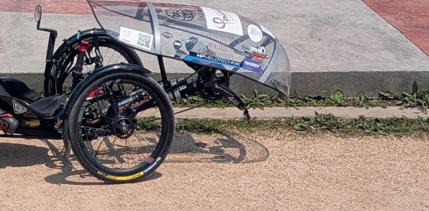 His other gear included a carbon fibre ICE Sprint trike – a fast, foldable, recumbent (back-supported) tricycle – mainly he says to “avoid the neck and shoulder issues I get day after day on a conventional bike”.