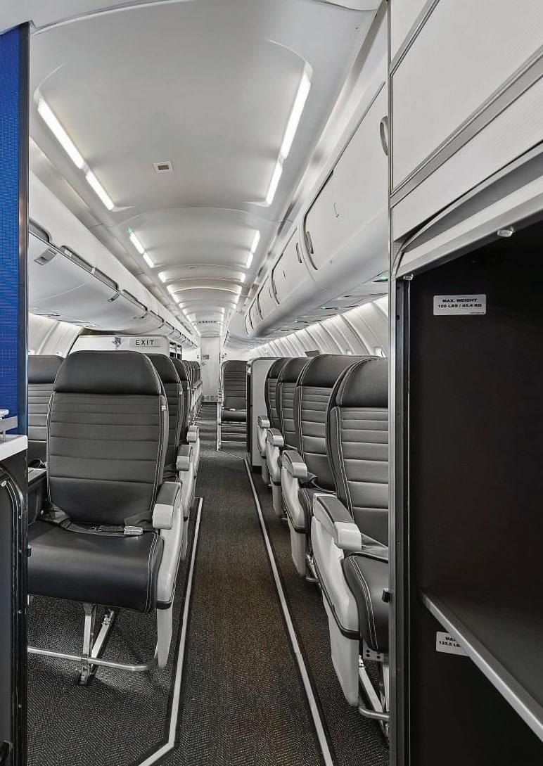 The GoJet Airlines team was tasked with designing an aircraft cabin within the CRJ-700 body that could accommodate all three levels of cabin pricing and use the additional space of the bigger aircraft to create a unique passenger experience and ease the burden on small flight crews.