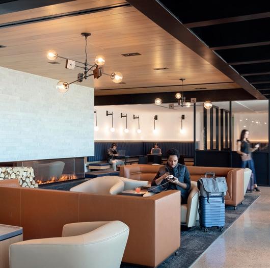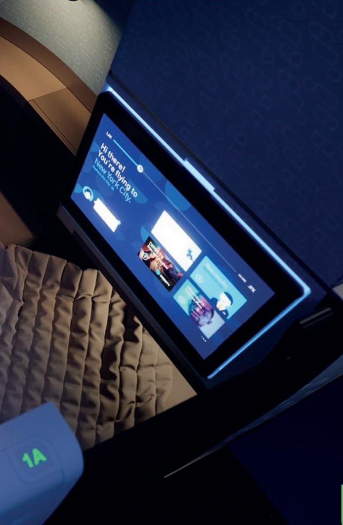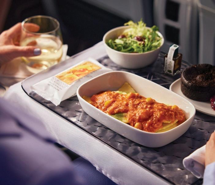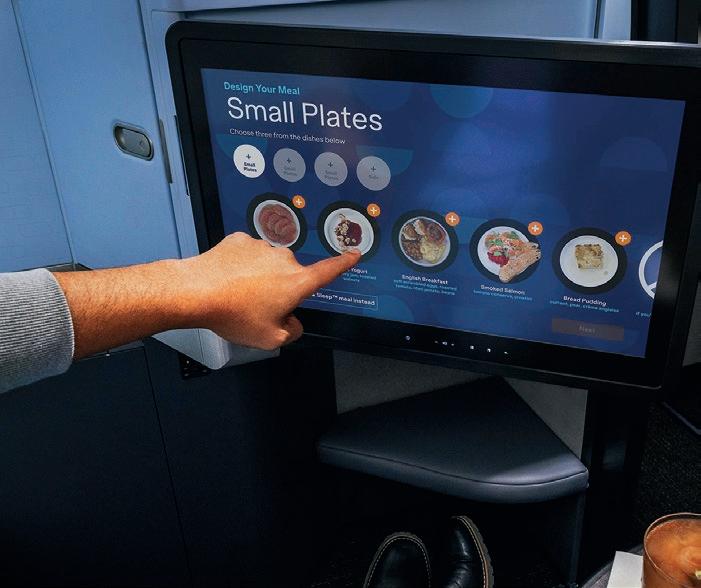 THE BOARDING The United Club lounge appears small at first glance but it's spread over two floors so there is plenty of room to relax. I grabbed a prosecco from the bar, which serves a full range of beers, wine and spirits and cocktails, before visiting the wellstocked buffet. The runway view and the fun robot that helps clear dishes were a perfect diversion while I enjoyed a couple of tacos and a great cheeseboard. It’s worth noting that United keeps its lounges quiet, with no boarding announcements, so the onus is on passengers to keep track of their flight’s boarding status. There was a