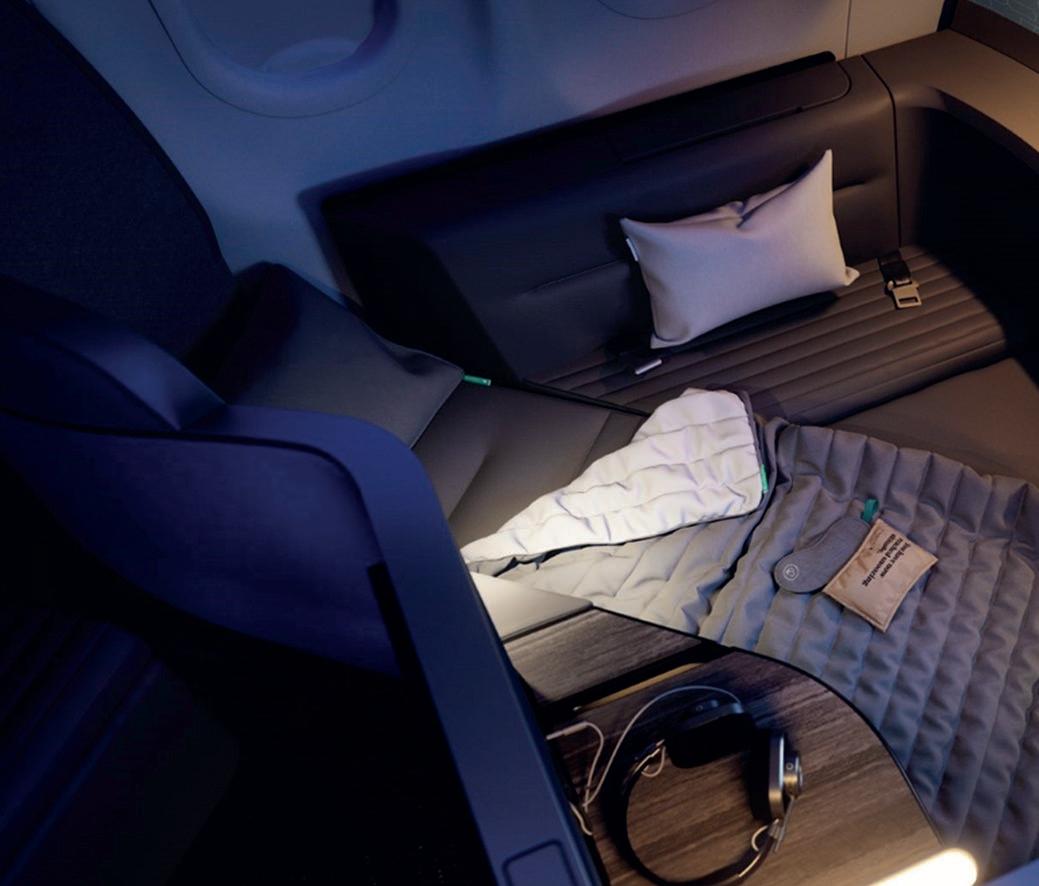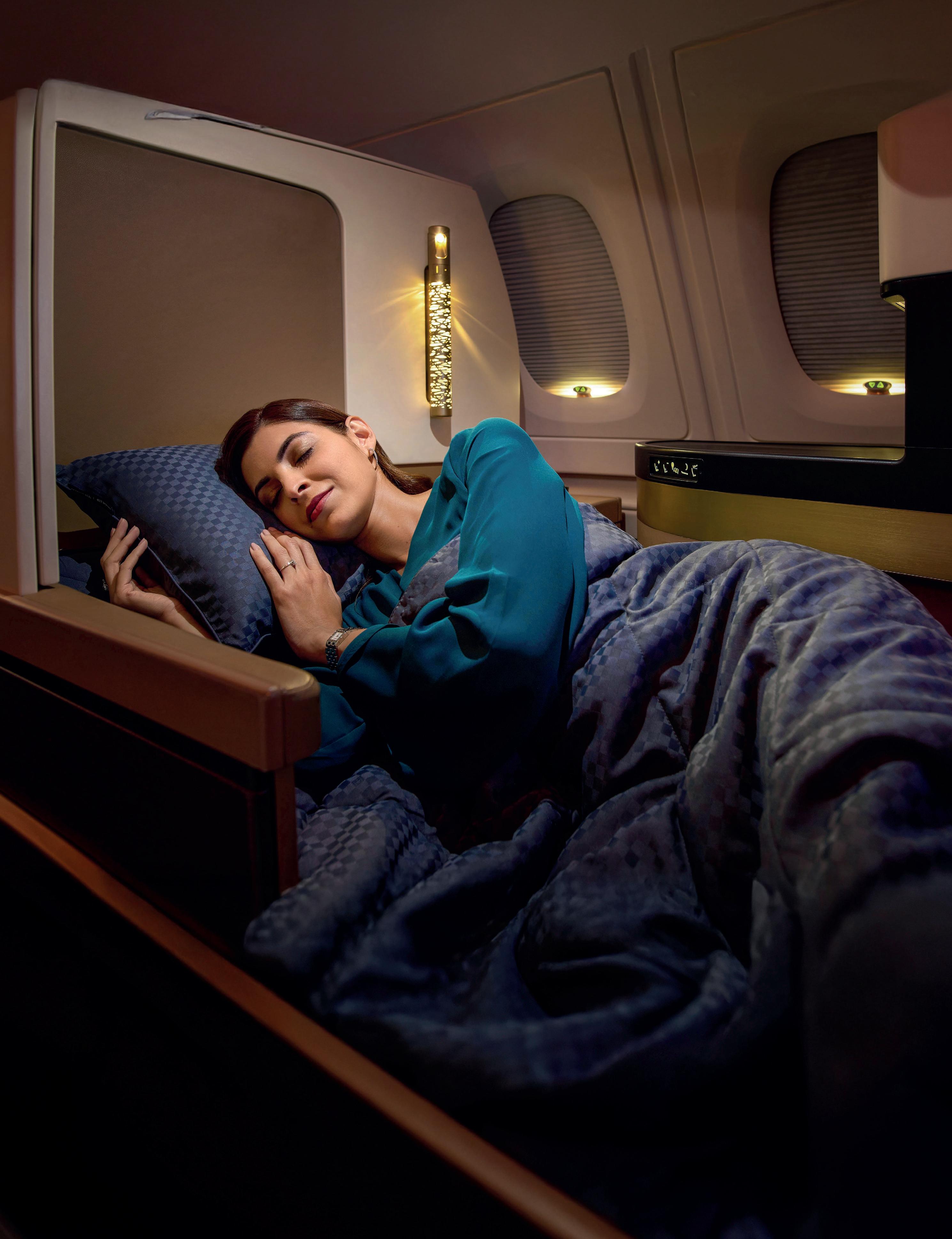 THE SEAT Polaris seats all have aisle access, and since I was travelling with a companion we’d opted to sit in the ‘middle’ section of two (me in 4D). You can’t fault the seat for space and comfort, and the fact it converts into a fully-flat bed was especially welcome with an overnight journey ahead. The angle of the central seats adds an element of extra privacy if required, along with the high privacy screen. The seat itself had good storage, and an eye-level shelf with a couple of bottles of water is a nice touch that is perfect for storing things like books and glasses that you might want to have close to hand. There was no faulting the Therabody amenity kit that was packed with luxurious toiletries either. Noise reducing headphones and extras such as a cosy mattress topper, plush pillow and a SAKS Fifth avenue blanket added to the vibe that getting a great sleep was a priority.