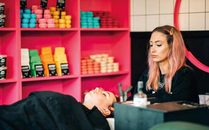 so that customers can try the product immediately and, through mirrors, see the results. In Liverpool, inside the Lush shop, there is The Shampoo Bar, a space where customers are assisted by a Lush Shampoo Therapist (an experienced professional) and can try out shampoos or hair masks and then be helped by a hairdresser to comb their hair. The shop has loungers and wash stations.