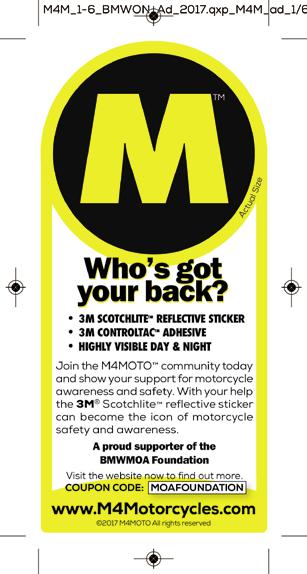 BMW ON (ISSN:1080-5729) (USPS: 735-590) (BMW Owners News) is published monthly by BMW Motorcycle Owners of America Inc., 2350 Hwy 101 South, Greer, SC 29651. Periodicals postage paid at Pewaukee, Wisconsin and additional mailing offices. Opinions and positions stated in materials/articles herein are those of the authors and not by the fact of publication necessarily those of BMW MOA; publication of advertising material is not an endorsement by BMW MOA of the advertised product or service. The material is presented as information for the reader. BMW MOA does not perform independent research on submitted articles or advertising.