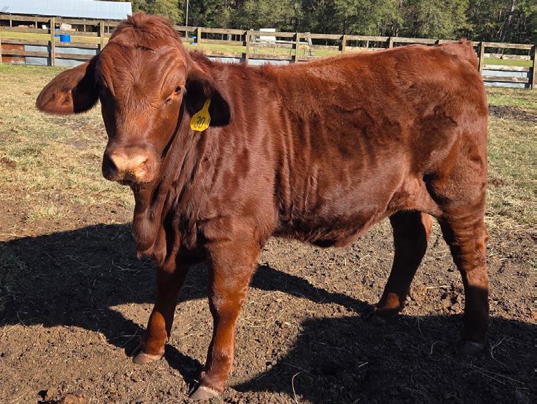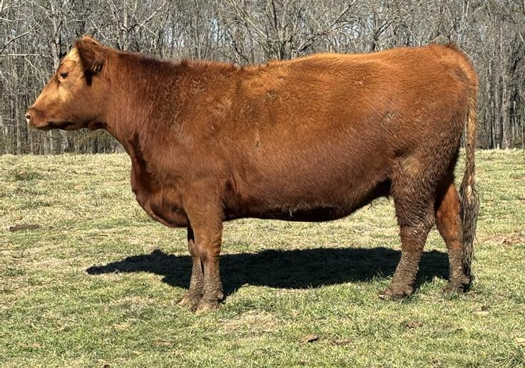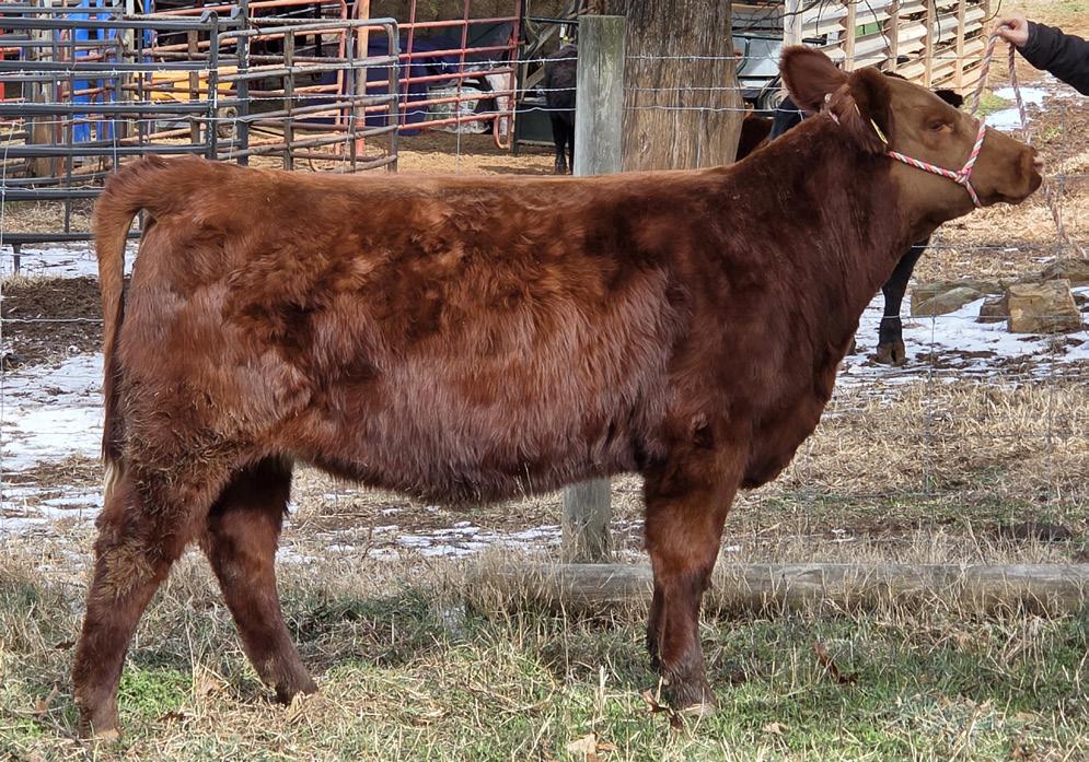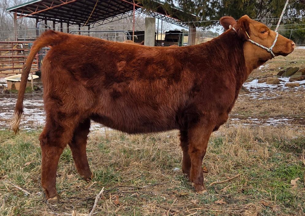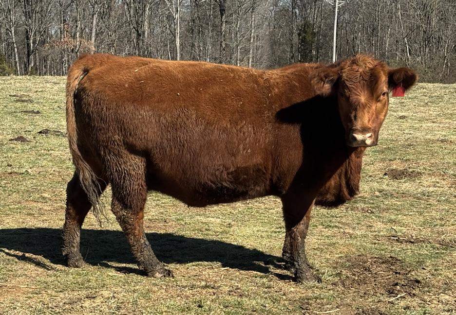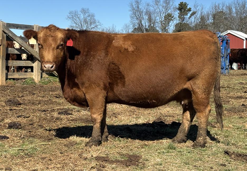 Here is a fancy baby doll Beef Master/Santa Gertrudis Cross. She is a fine cross bred that you can breed to the bull of your choice. She is sired by Woods 9-20 polled Santa Gertrudis bull that produces great replacement females. DOB: 5/20/25