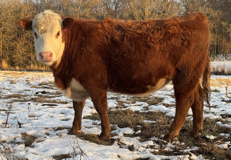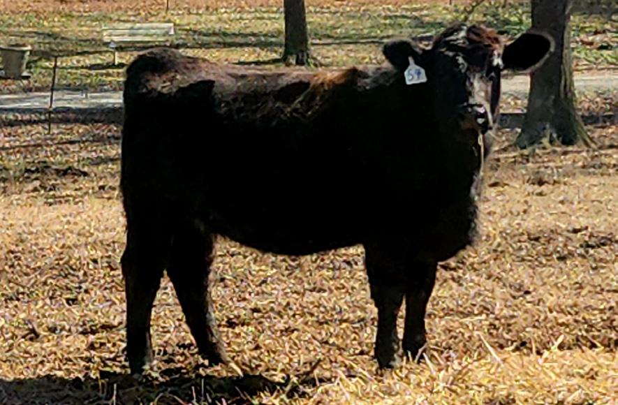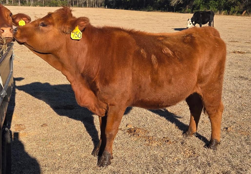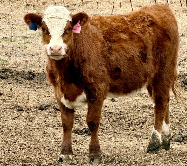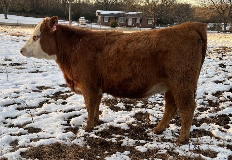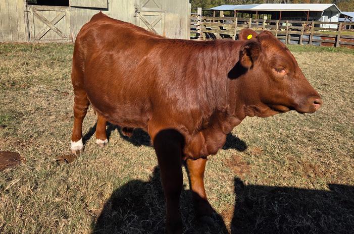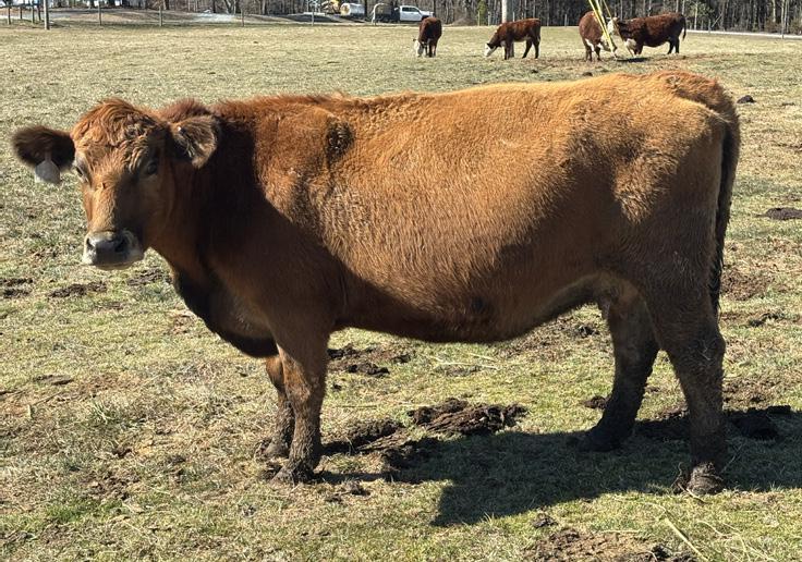 Here is a fancy baby doll Beef Master/Santa Gertrudis Cross. She is a fine cross bred that you can breed to the bull of your choice. She is sired by Woods 9-20 polled Santa Gertrudis bull that produces great replacement females. DOB: 5/20/25