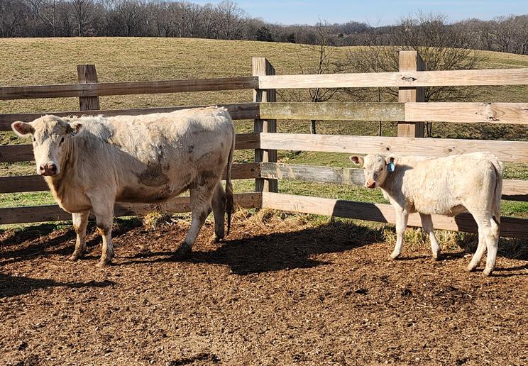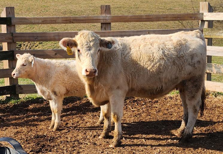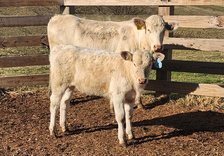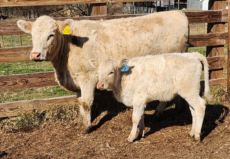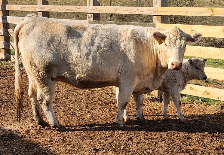 3 Charolais heifers (3 years old) with first calf at side. These 3 year olds have Char Angus calves. All have been pasture exposed to our Angus clean up bull (AAA 21014049) since Jan 12, 2026. All these are home raised heifers. Never creep or self fed. Bucket fed after weaning to promote docility. Additional sire information on Sale Day