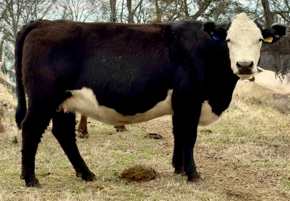 A 7 year old Sim Angus commercial cow. She is 8 months bredexpected to calve close to sale day.