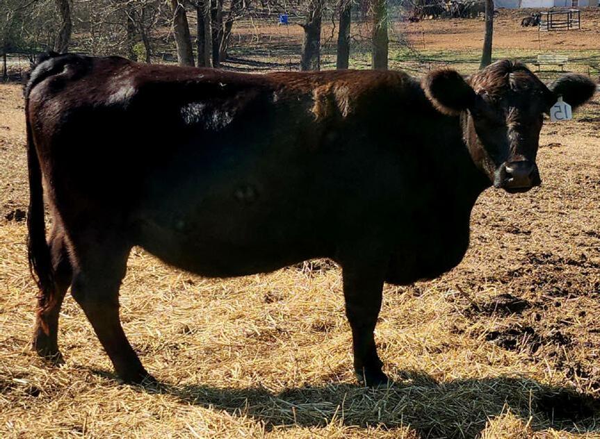 A 7 year old commercial Red Angus cow. She is 8++ months bred to registered Hereford bull and will calve anytime.