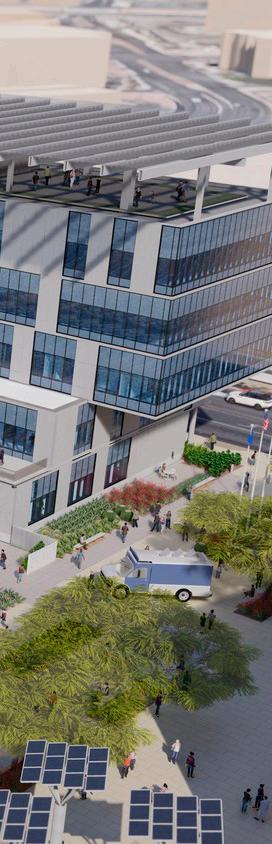 BNIM has developed a vibrant concept design for the Block A development in Makers Quarter. This development is a 35-story mixeduse building, comprising of a residential tower, commercial office tower, retail suites on grade, a grocery store that utilizes an existing historic façade, and a movie theater venue. This dynamic development engages strongly with the public realm in activating the street with highly active retail uses. The public amenity spaces include sidewalk cafes and multiple elevated green roof plaza decks, which would be shared by building occupants. The residential and office towers take advantage of east/west solar orientation for passive design strategies to optimize its energy performance and sustainability goals for the project. The office tower was developed on shallow floor plates dimensions to promote daylighting throughout the interior space and develop a highly flexible and creative office environment. The overall development integrates public art installations with the architecture, promoting culture and creativity within this development.