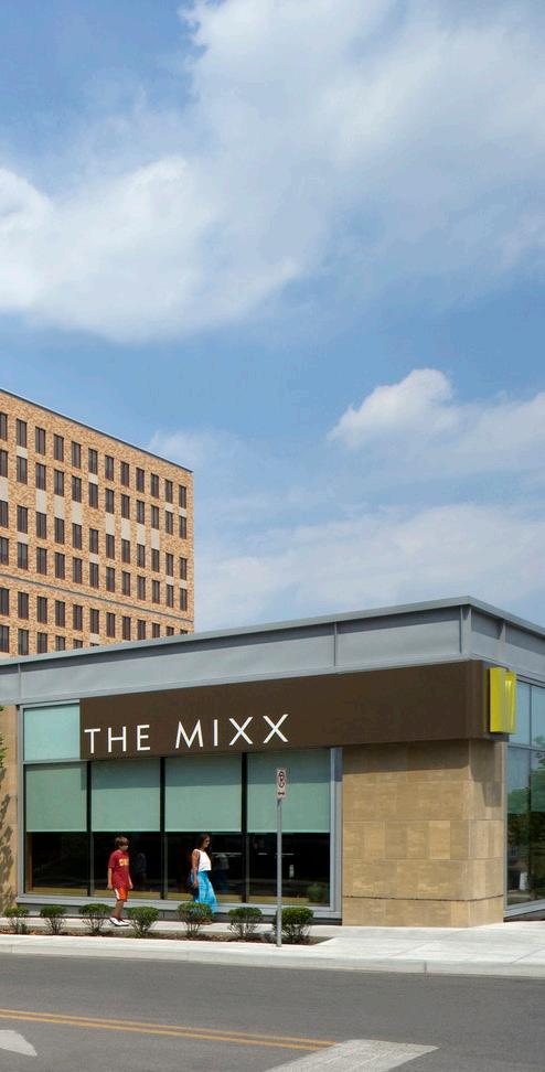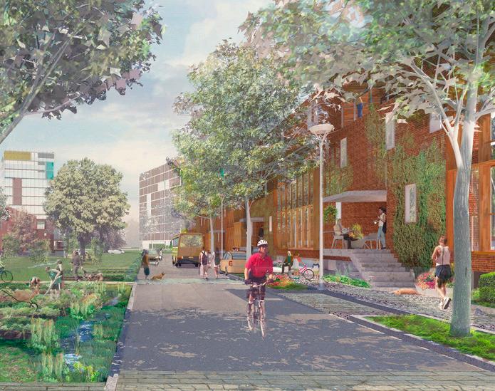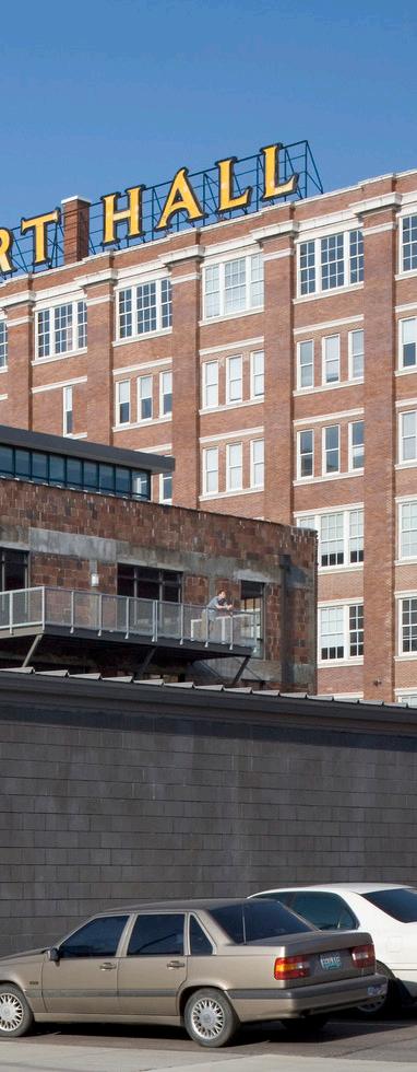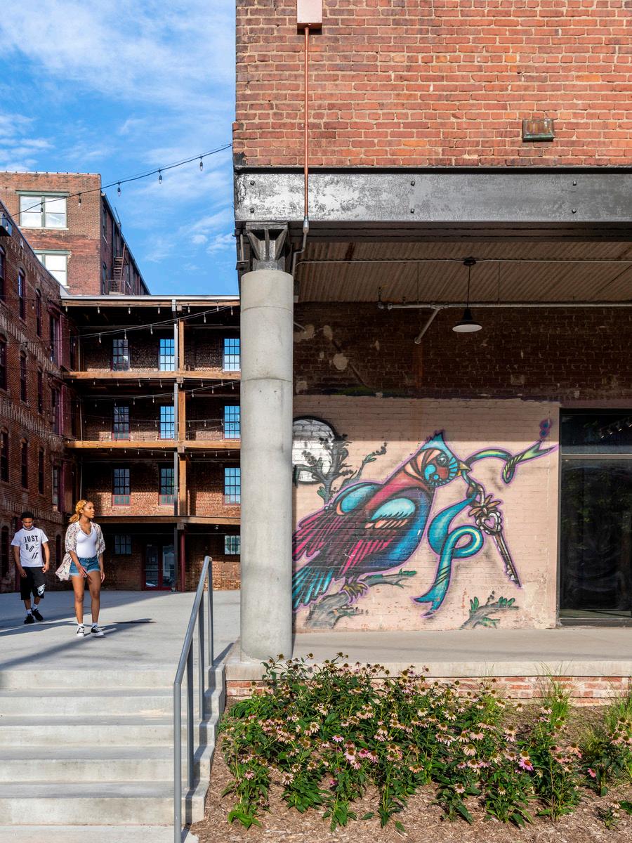 A large mid-block courtyard provides a place for community and features native plantings to accentuate a post-industrial landscape returning to nature. Over the past few decades, talented street artists from across the region have transformed the brick walls of this neighborhood into an openair art gallery. This informal invitation remains open, and new murals have continued to appear on the courtyard and alley walls.
