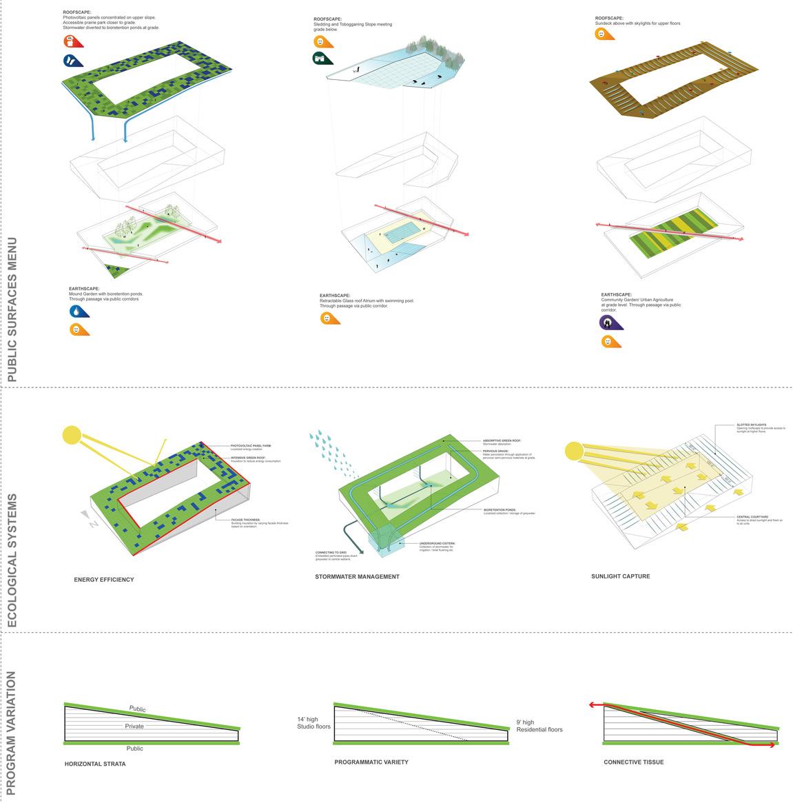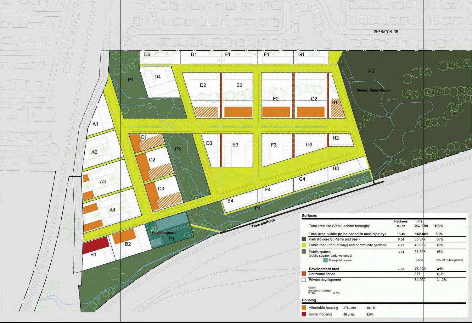 The Petite Riviere Redevelopment Plan aims to transform an existing golf course site in Montreal, Quebec, into a high performance, sustainable community. Montreal developer Groupe Pacific envisions a neighborhood that strengthens community, provides a healthier quality of life and restores the environment with a 60% ecological footprint reduction. The design team worked towards achieving ten principles set forth in a One Planet Communities Sustainability Action Plan for the site: zero carbon; zero waste; sustainable transport; local and sustainable materials; local and sustainable food; sustainable water; natural habitats and wildlife; culture and heritage; equity and fair trade; and health and happiness.