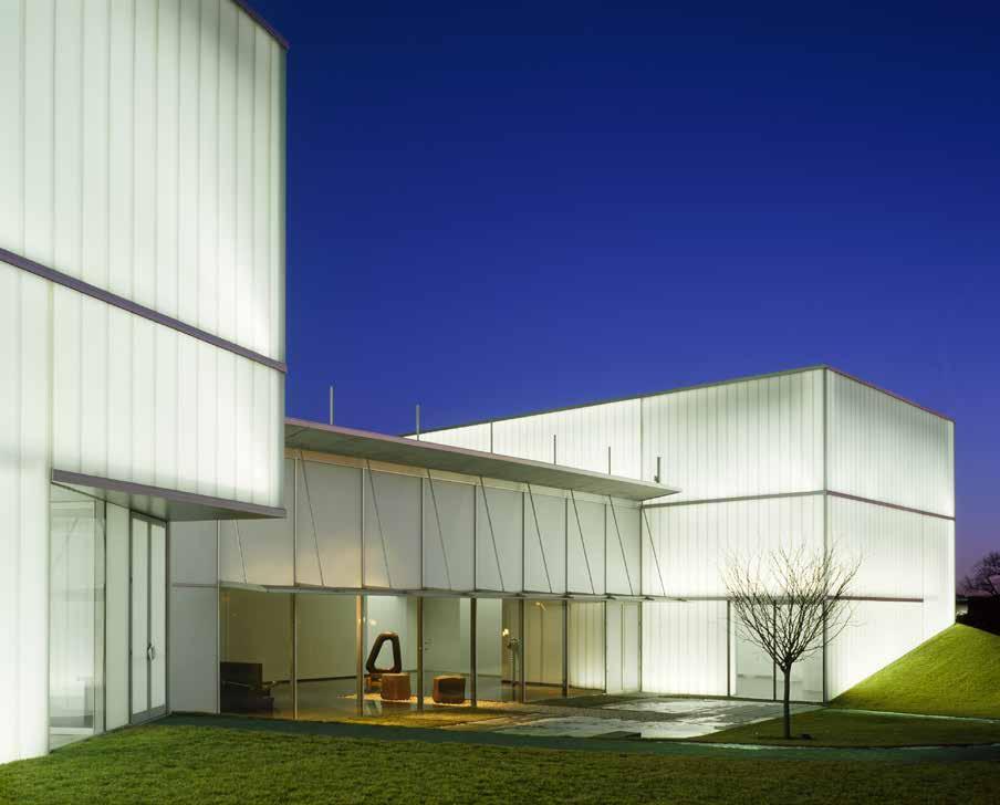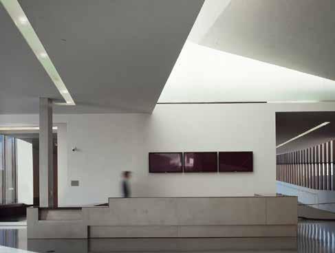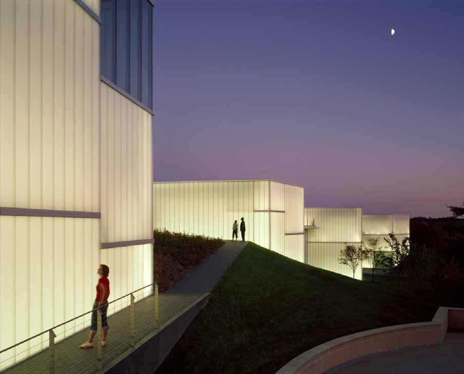 Considered a “feather” to the original museum’s “stone,” five lenses dot the landscape and allow diffused light to enter the galleries below and respond to the surrounding topography. Moving through the addition, visitors experience a flow between light, art, architecture and landscape.