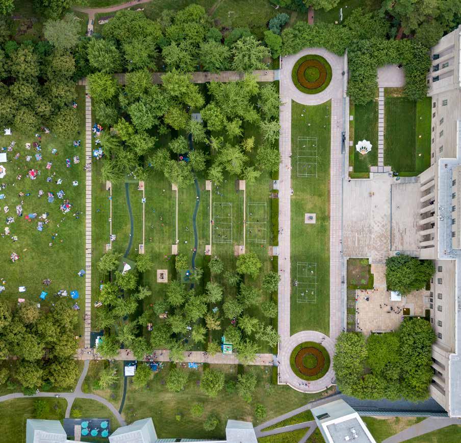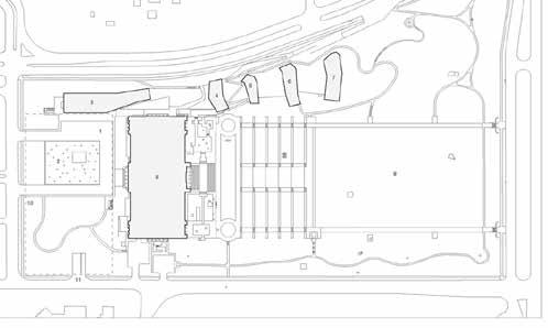 The lenses are woven into the landscape of the Sculpture Park, and space between the lenses features ground covering including grass and low shrubs. An exterior sculpture garden continues up and over the gallery roofs, creating sculpture courts between the lenses, while also providing green roofs to achieve high insulation and control storm water.