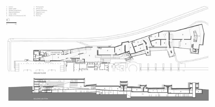 The interior of the building, linked with stairways and ramps, encourages a natural flow throughout the long structure, allowing visitors to look from one level to another and form inside to outside. The partially submerged space includes the Isamu Noguchi Sculpture Court, featured exhibition galleries, and galleries for contemporary art, photography and African art.