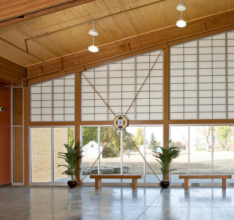 the precast and metal sunshades were influenced by traditional floral and geometric patterns found in the Dakota flag and language. Dentalium dresses inspired the colors and textures throughout the building. The circular shape of the shared community space within the building represents the 7 directions: cardinal directions, sky (through the oculus in the ceiling), ground, and the human soul as the center.