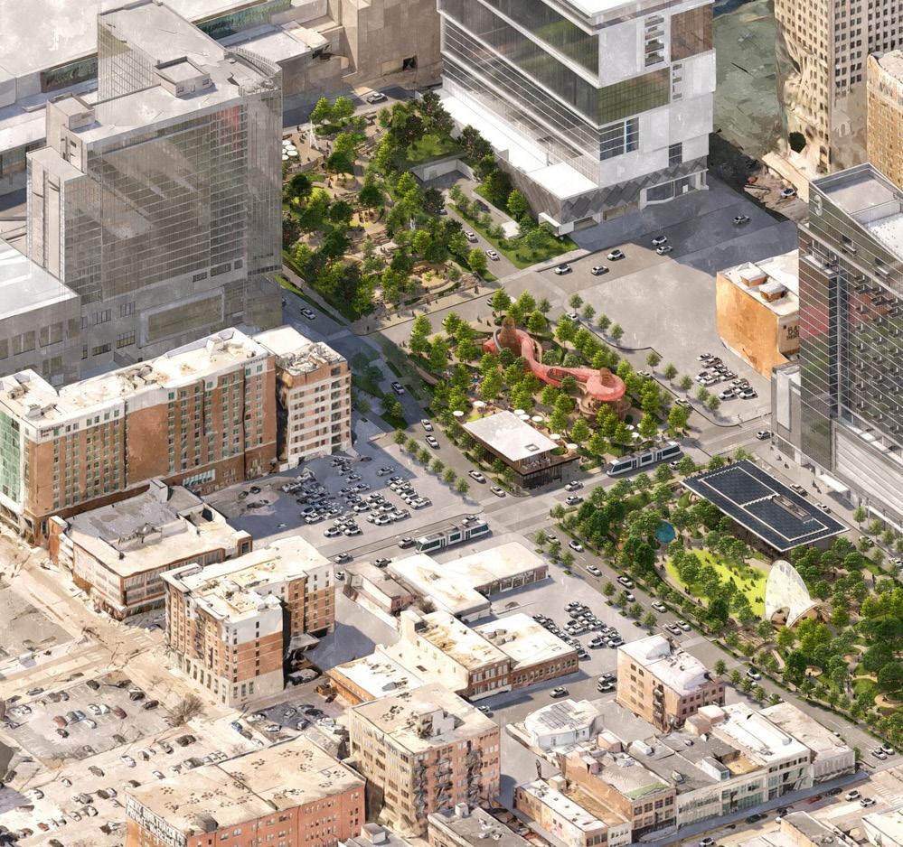 The South Loop project is part of the reimagining of the I-670 corridor to create an enhanced, green mobility hub within Downtown Kansas City, Missouri, that emphasizes multimodal transportation including enhanced vehicular, pedestrian, bicycle, and transit connections; regional job access; green and healthy living spaces; private development; and climate responsiveness. BNIM is part of a multidisciplinary team with HNTB and OJB, contributing to this futurefocused initiative for Kansas City. Situated between the southern edge of the Central Business District and northern edge of the Crossroads District, the new South Loop will consist of a 5.5 acre site on top of a below-grade portion of I-670, transforming this area into a downtown destination and community connector.