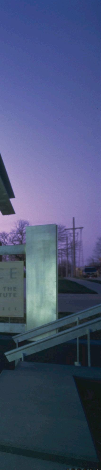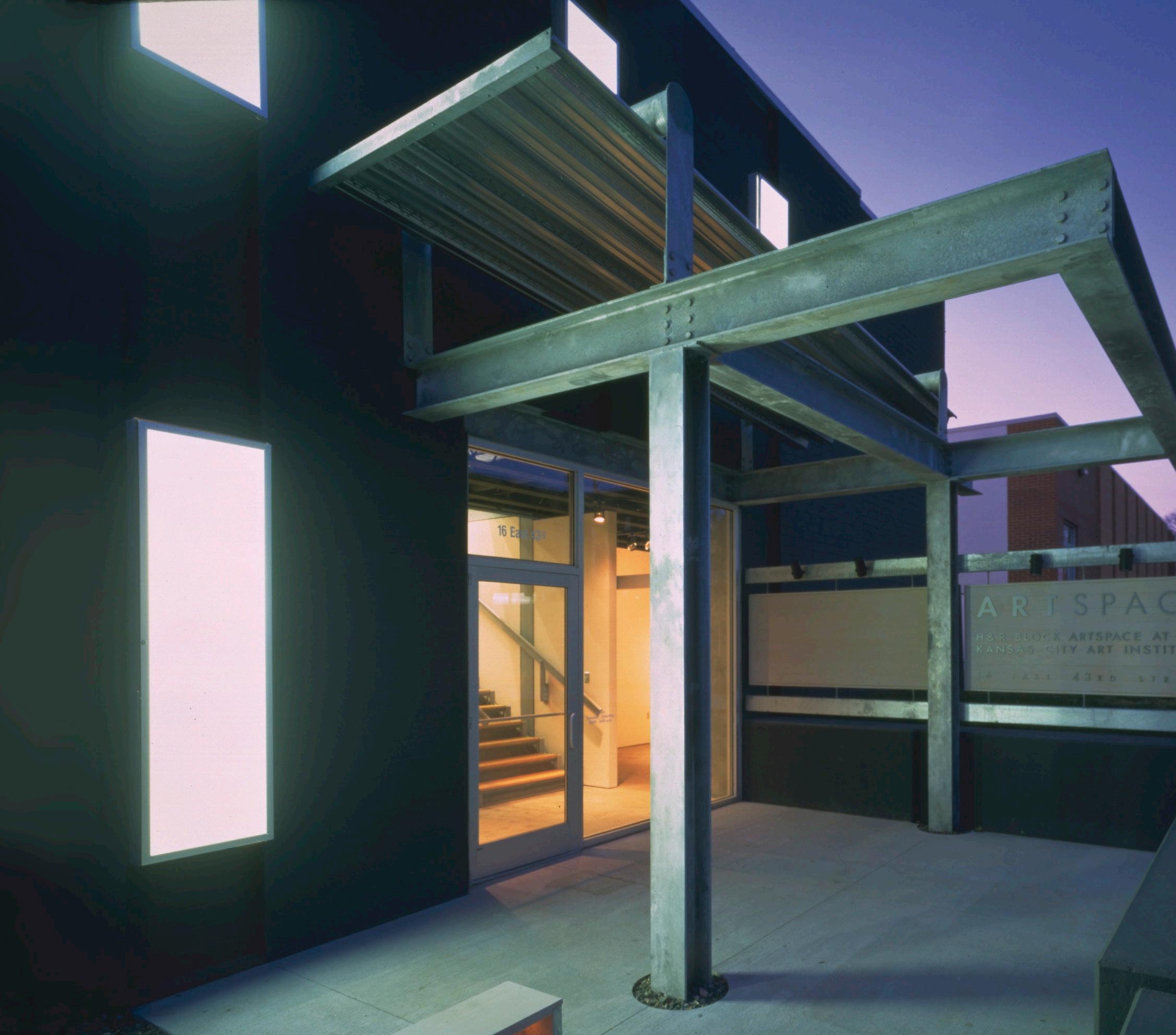 The Kansas City Art Institute hired BNIM to transform a 1960s abandoned building into a gallery space for the private arts college. The 2-story, L-shaped volume was punctured to create an atrium with new laminated glass openings, bathing the entry in daylight. The existing steel beam dividing the two halves of the structure was the departure point for the new entry element consisting of a canopy, a signature open stair, elevator, large storefront openings and an overlook into a new 2-story volume. The exterior vertical strip windows were re-invented as light boxes, and treated to provide a new layer to the façade and a glowing effect at night providing a contrast to the building’s monolithic character. Crushed basalt, galvanized steel, stained cypress, and natural and painted concrete form the material palette.