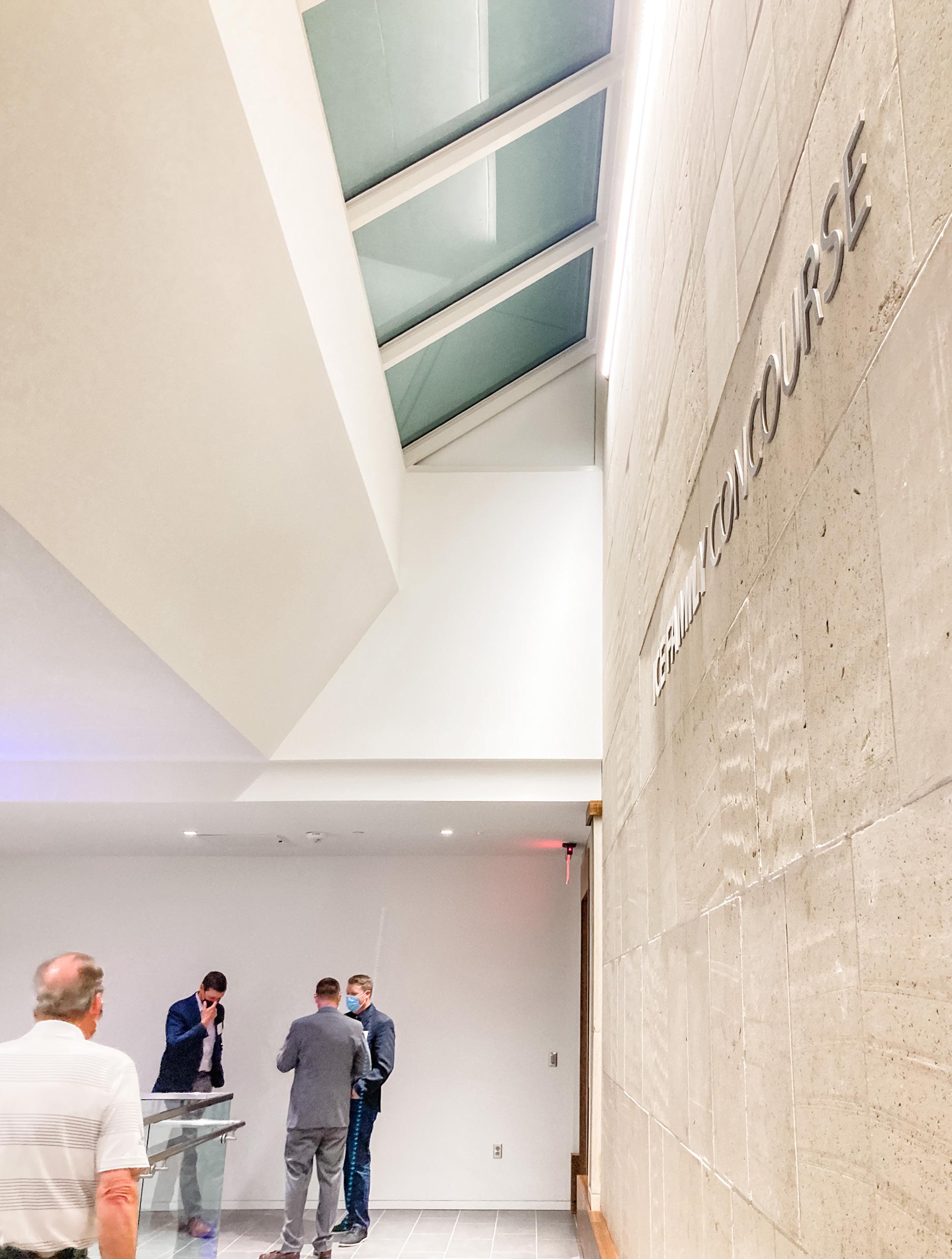 Connection and communication between the departments is facilitated in the vertical carving out of large open floor plates. Natural light and natural ventilation are inserted into the deep floor plates by the inclusion of what the design team calls "multiple centers of light." Several vertical cutouts are designed to foster interaction between the facility’s four levels. The atrium provides a central skylight and circulation space that results in a powerful core of the building.