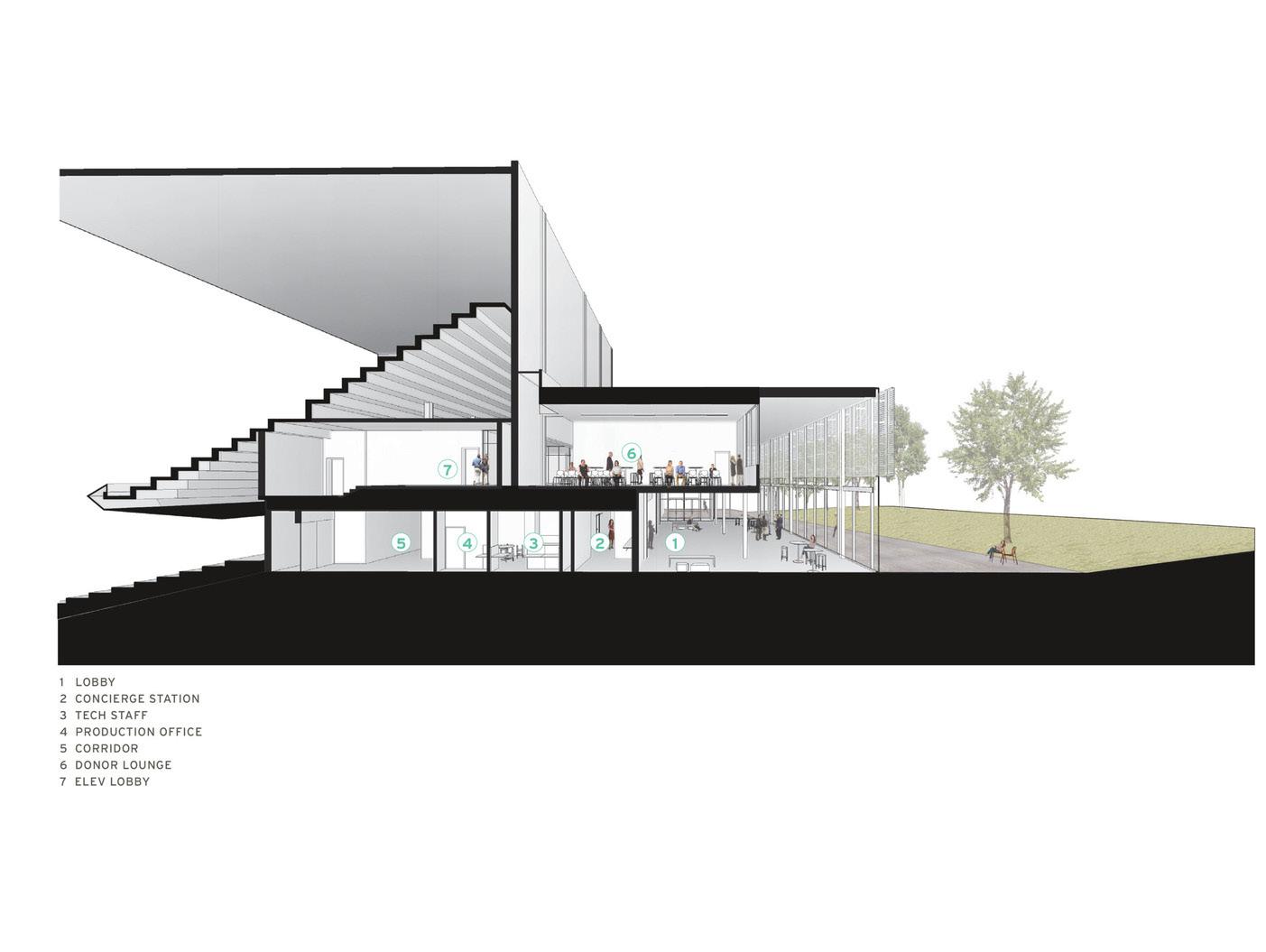 With the goal of increased use and viability of the venue, the reimagined facility includes a new extension to the west of the existing auditorium space to serve as a welcoming and celebratory gathering space that also provides visual connections to the adjacent quad and the new exterior courtyard to the west. The lobby space is also home to a repurposed and modernized ticketing/concierge space and includes new spaces for event concessions and merchandise sales. An additional multipurpose room space, elevated above the new lobby and clad in limestone, is held away from the box of the existing auditorium to allow light into the lobby and to emphasize the existing auditorium form. This design study focused on improving the community outreach experience by adding a more intimate multi-purpose room and performance space as well as lobby improvements to the existing 1,800-seat auditoriuman opaque limestone box that houses the current lobby and auditorium.