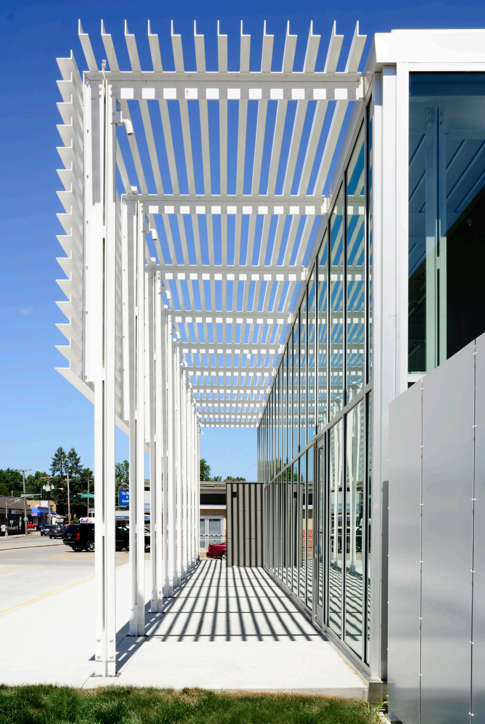 high-efficiency, partially fritted glass sunscreen steel frame sunscreen fins high-efficiency glass acoustic cloud ceiling roof