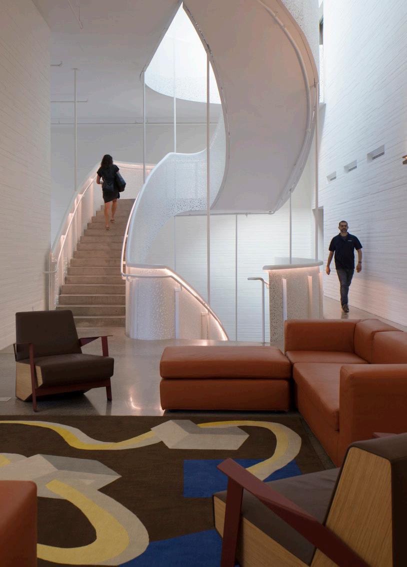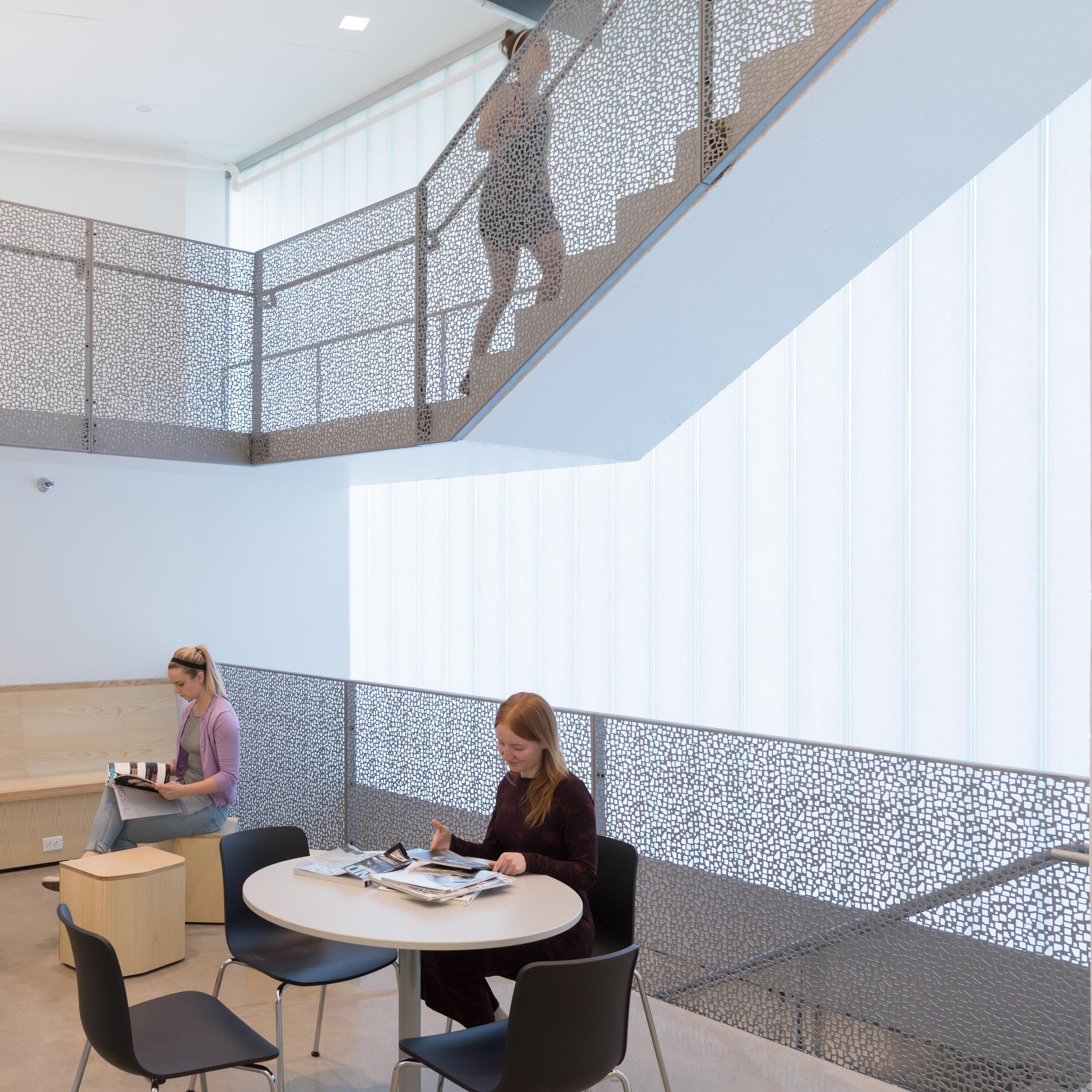 Sculptural open stairs are shaped to encourage meeting, interaction and discussion. Some stairs stop at generous landings with tables and chairs, others open onto lounge spaces with built-in seating.