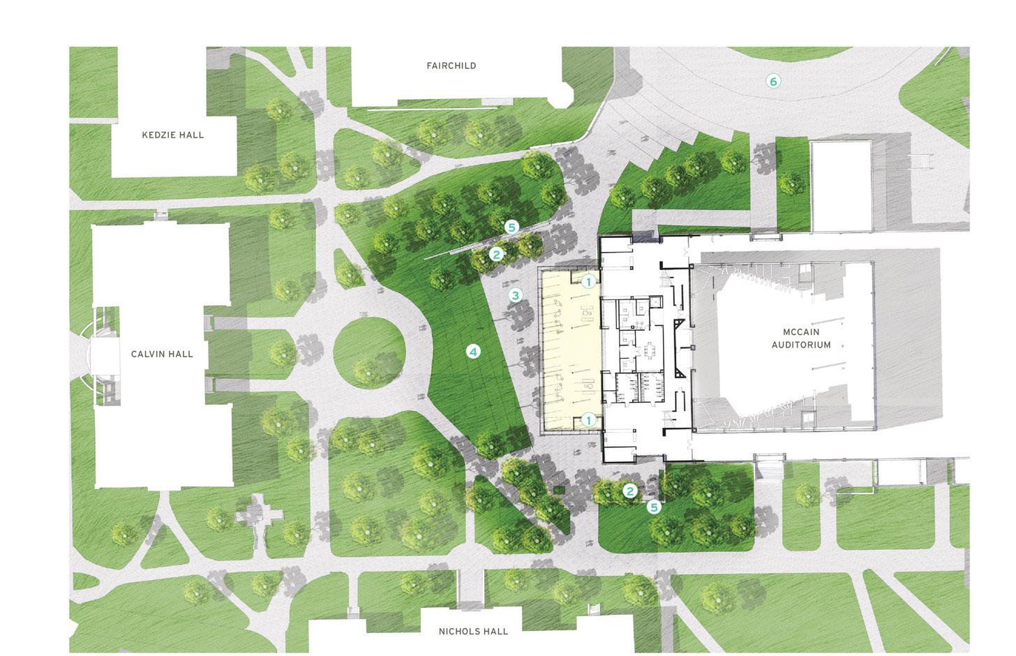 The design approach of the Kansas State University McCain Auditorium Lobby Addition and Renovation is focused on celebrating the performing arts by activating the surrounding campus precinct and creating potential for new and exciting experiences and activities by re-establishing McCain as a vital physical and cultural campus destination. The design solution aims to pay homage to the simplistic, formal geometry of the McCain Auditorium structure and responds to the existing, strong vertical and horizontal elements that currently help to define not only the building but the adjacent campus fabric, such as buildings, pedestrian and vehicular circulation, hardscape, and greenspace.