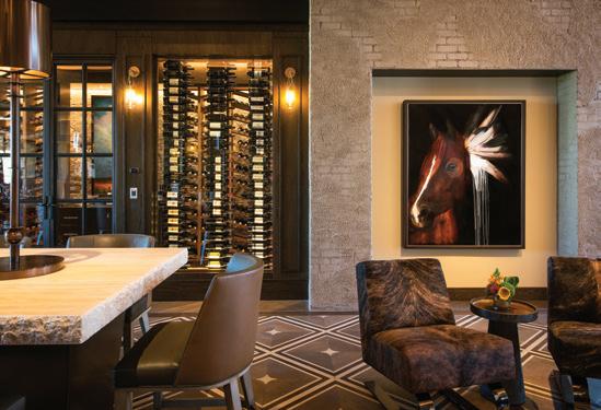 Drawing upon a palette of cool tones interspersed with hints of vibrant hues, we curated a collection of custom furniture, textiles, lighting fixtures and custom artwork that spoke to both tradition and modern sensibilities. One of the key art pieces included a bespoke hairon-hide piece based on regional influences, which is featured over the fireplace. We also discovered a local artisan with the skills to intricately capture the majestic mountainous landscape into a textile tapestry in the entry.