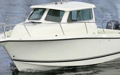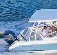 140 HP Honda in white. It includes fiberglass T-Top with electronics box, PFD storage, rod holders, LED light, dome